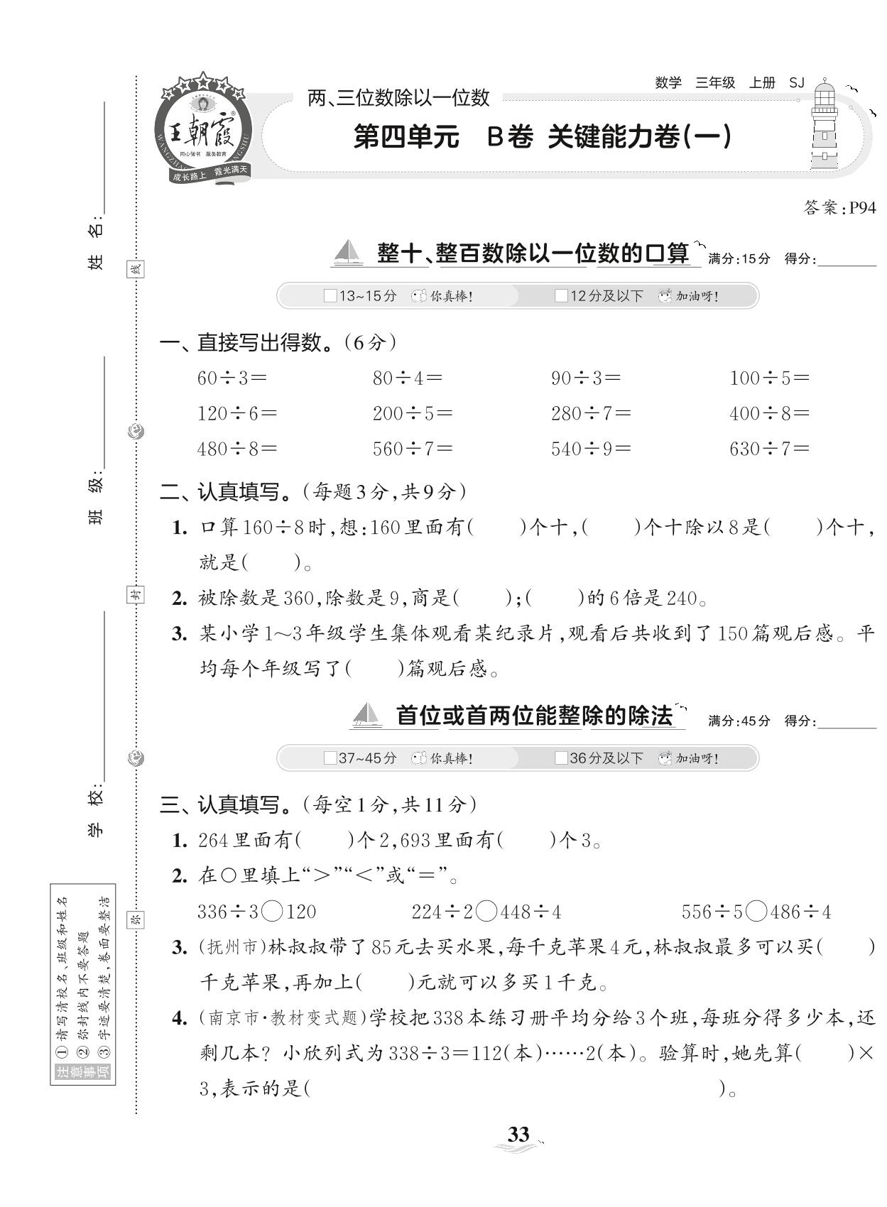 2023上册三年级数学苏教版 第四单元 B卷 关键能力卷(一)