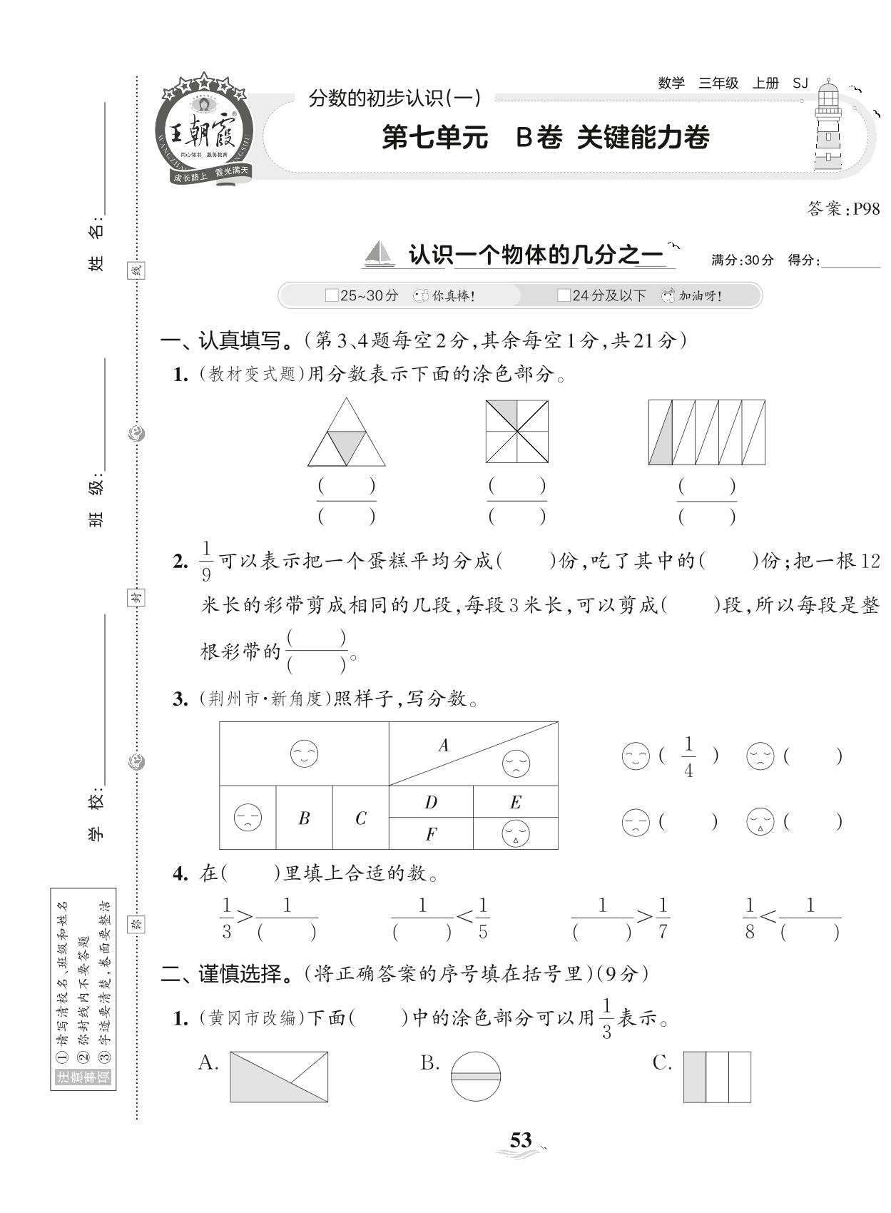 2023上册三年级数学苏教版 第七单元 B卷 关键能力卷