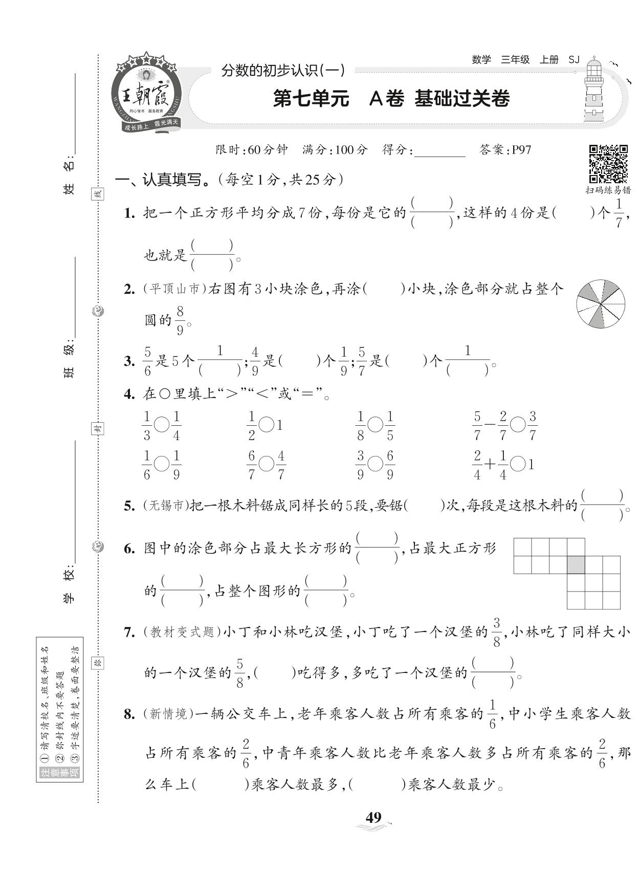 2023上册三年级数学苏教版 第七单元 A卷 基础过关卷