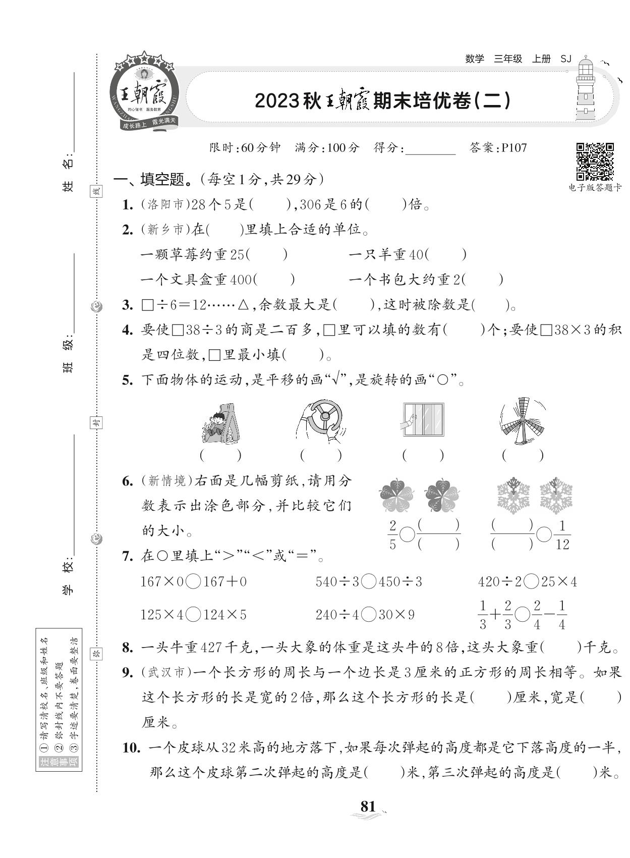 2023上册三年级数学苏教版 2023秋王朝霞期末培优卷(二)