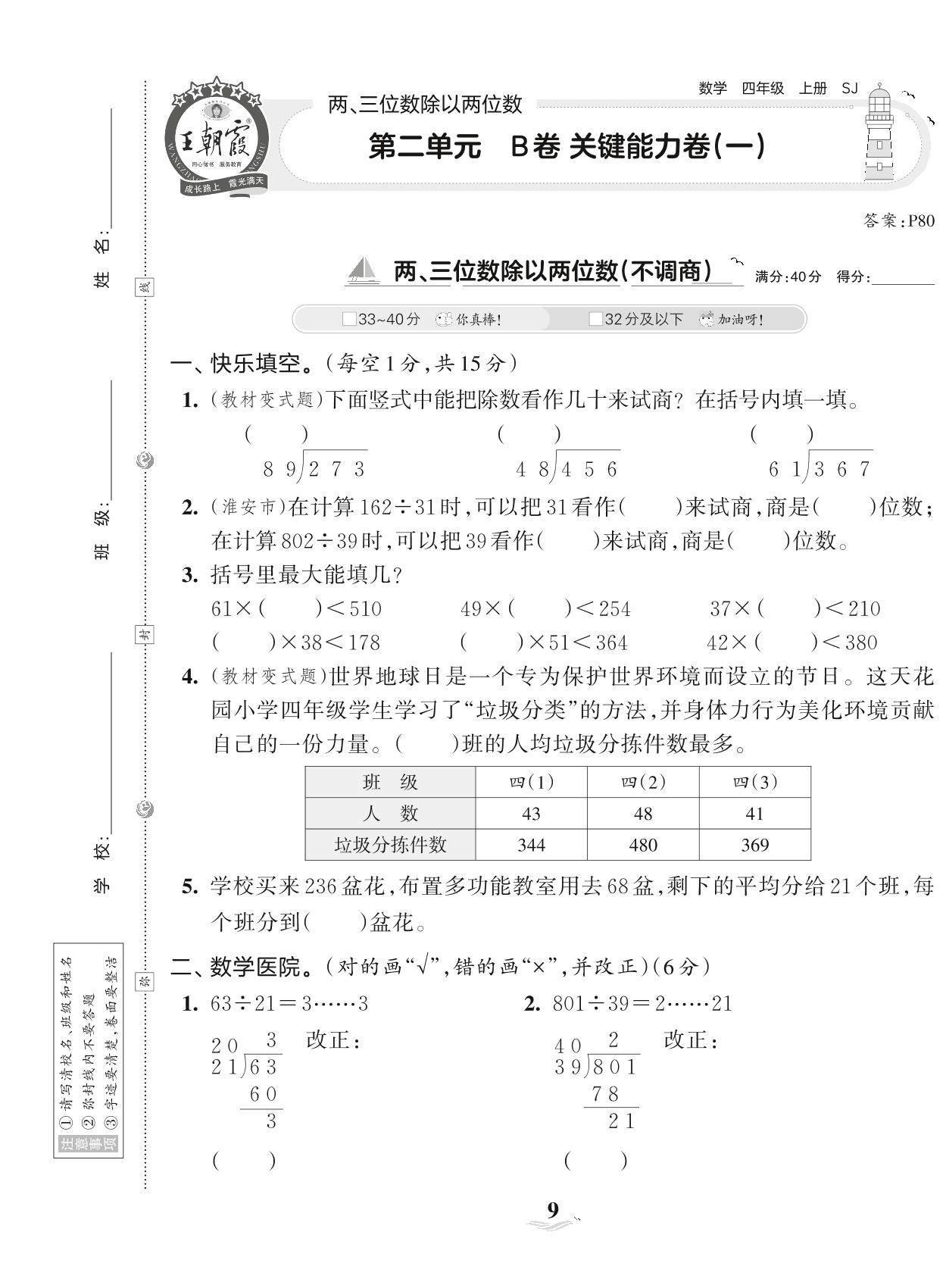 2023上册四年级数学苏教版 第二单元 B卷 关键能力卷(一)