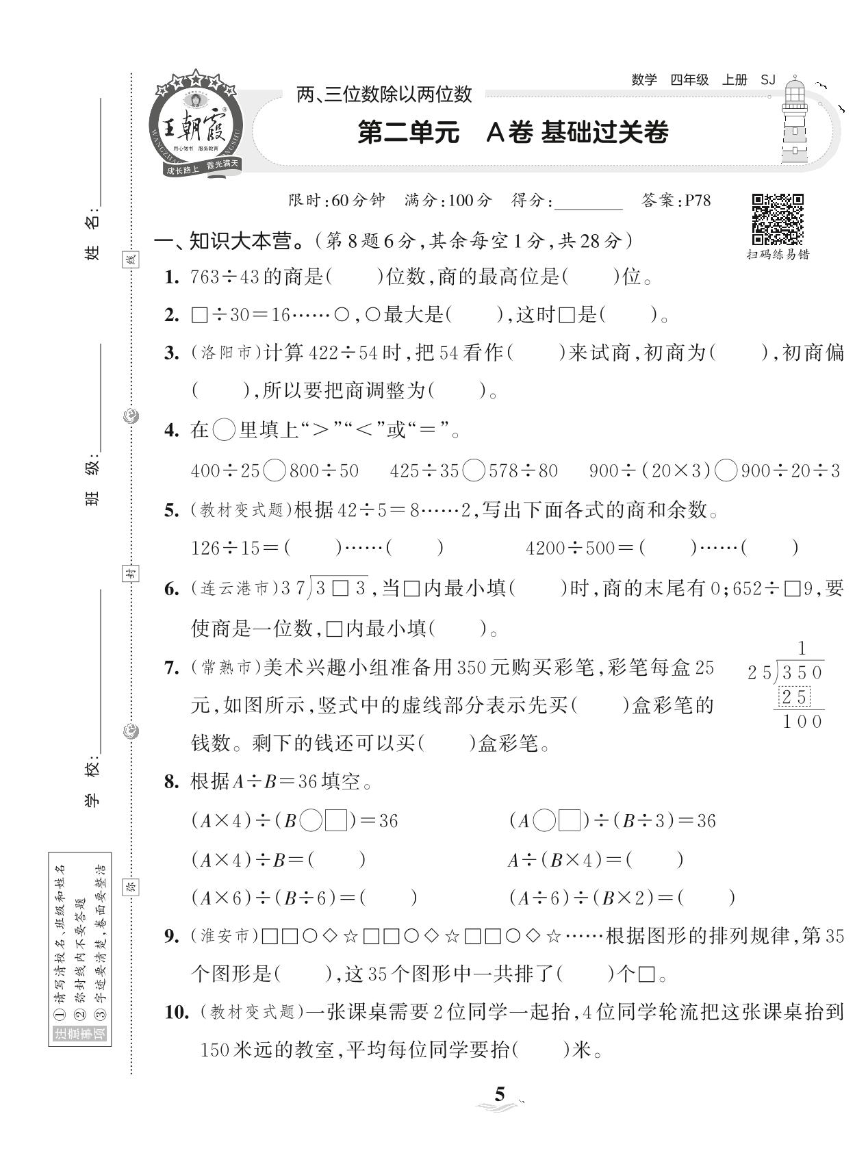 2023上册四年级数学苏教版 第二单元 A卷 基础过关卷