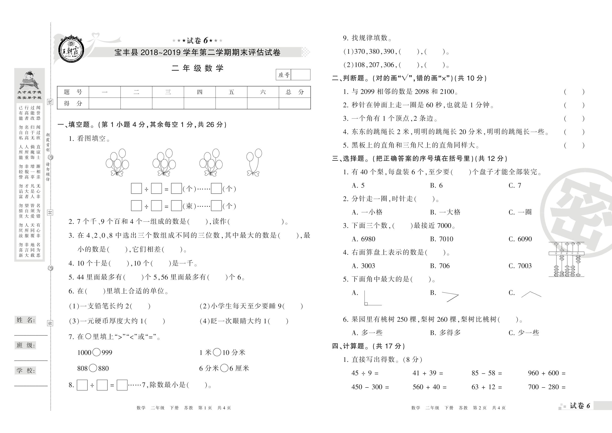 2018-2019学年第二学期平顶山市宝丰县二年级数学试卷(苏教版)【6】