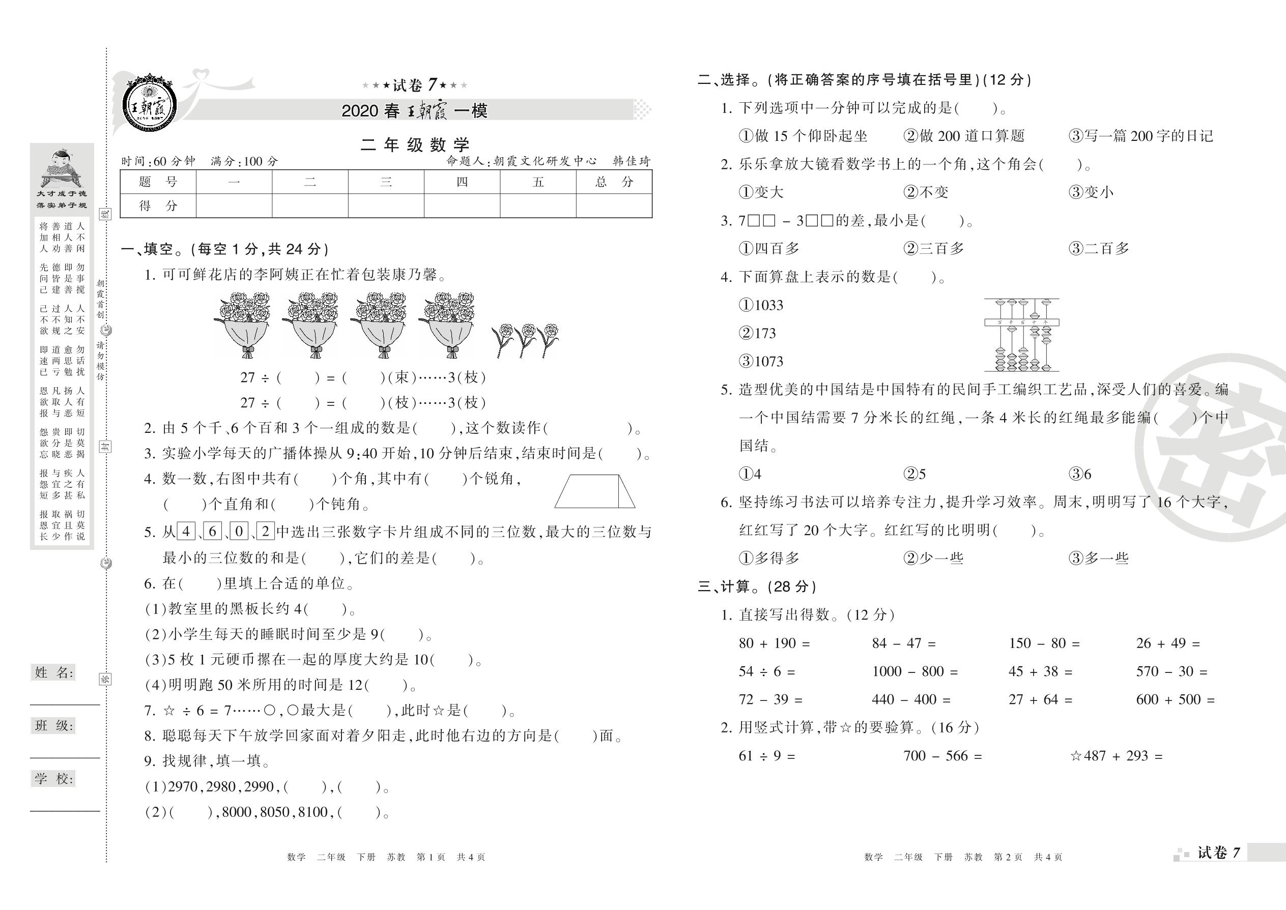 王朝霞期末模拟卷二年级下册数学(苏教版)_R21080391248【7】
