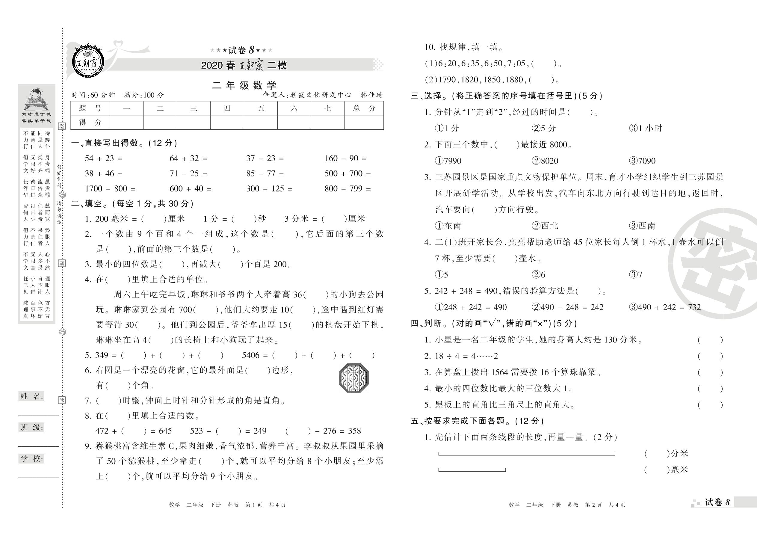 王朝霞期末模拟卷二年级下册数学(苏教版)_R21080391252【8】