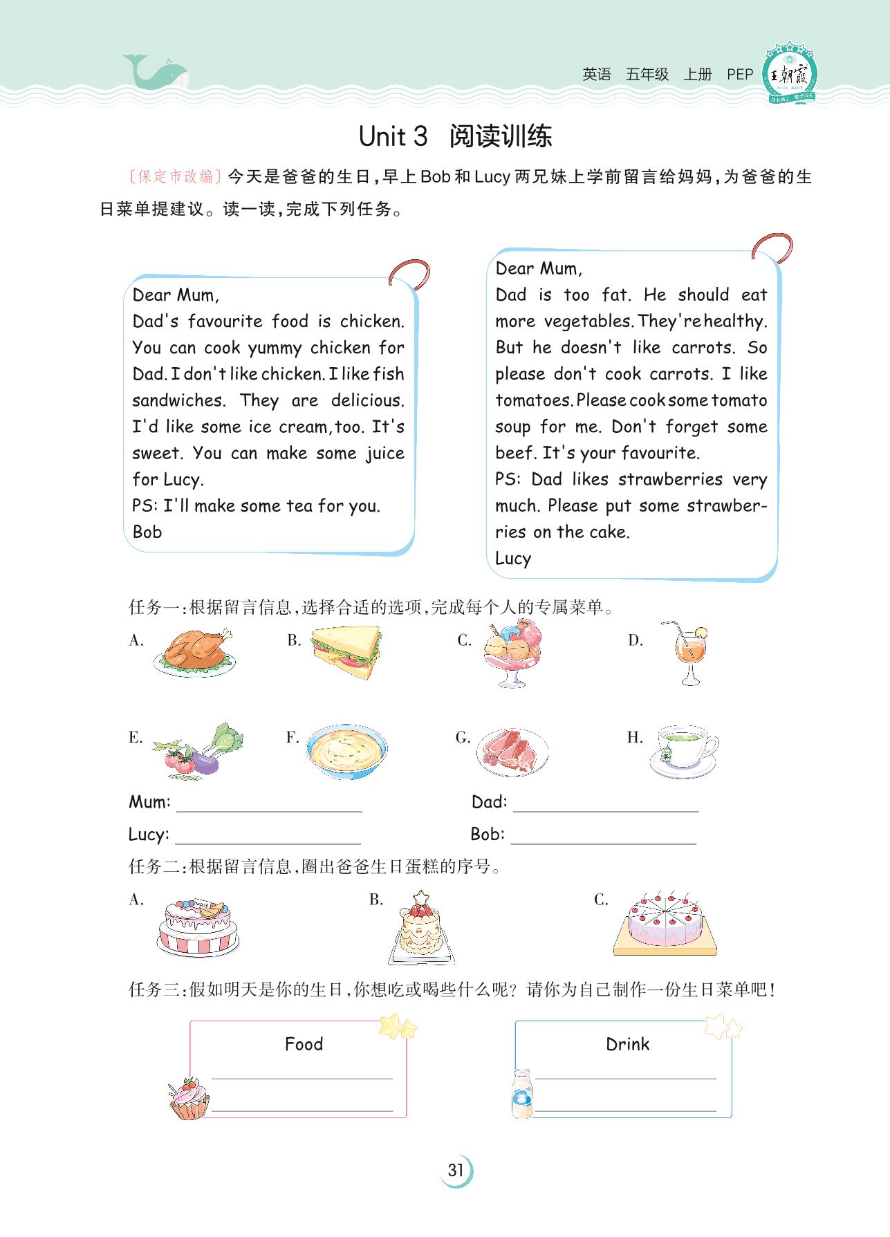2023上册五年级英语人教PEP版 Unit 3 阅读训练