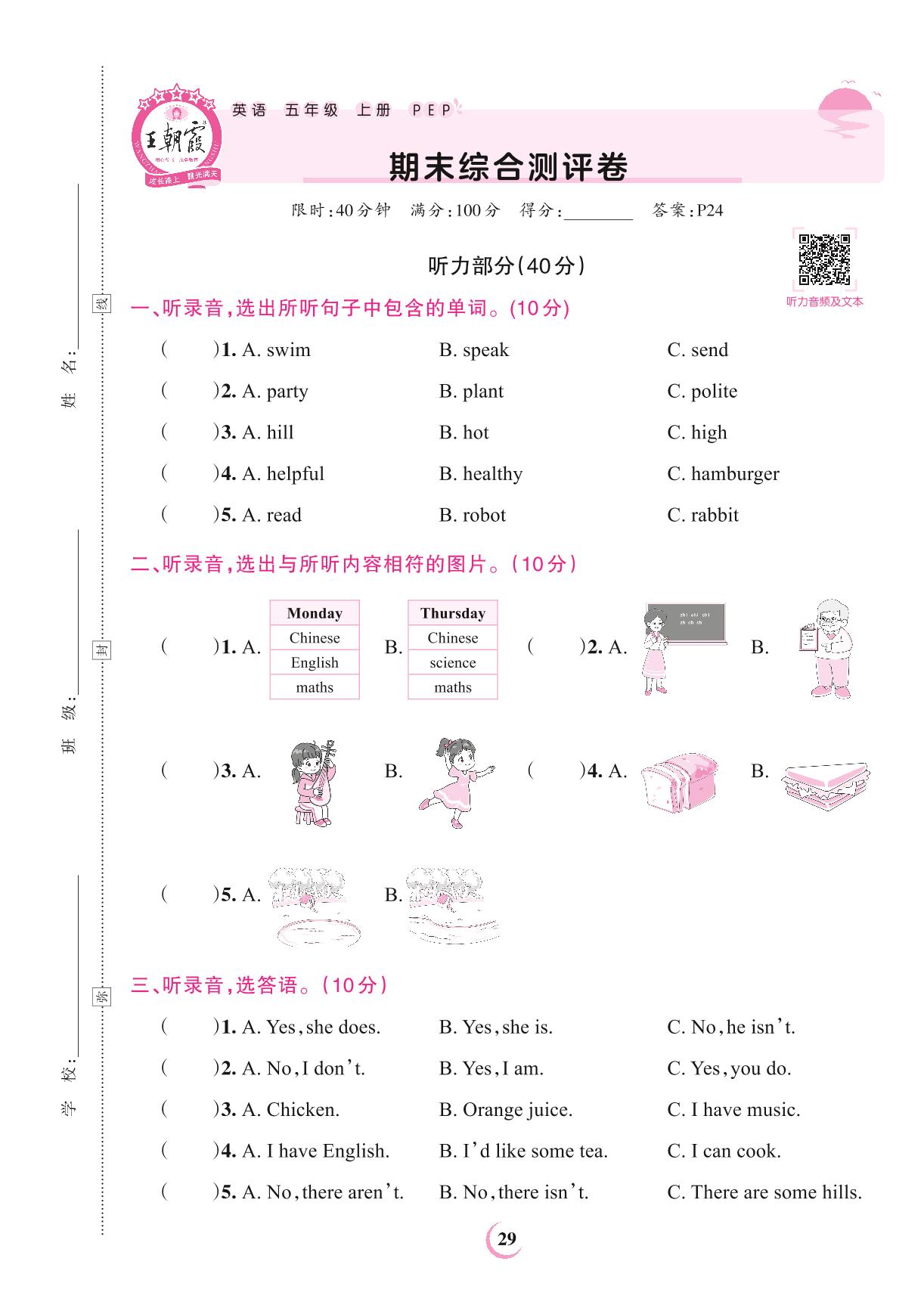 2023上册五年级英语人教PEP版 期末综合测评卷