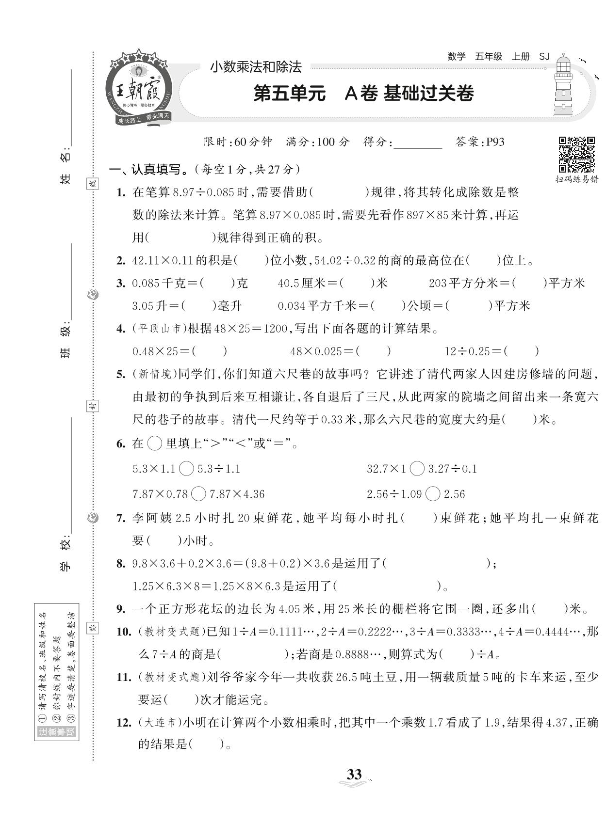 2023上册五年级数学苏教版 第五单元 A卷 基础过关卷