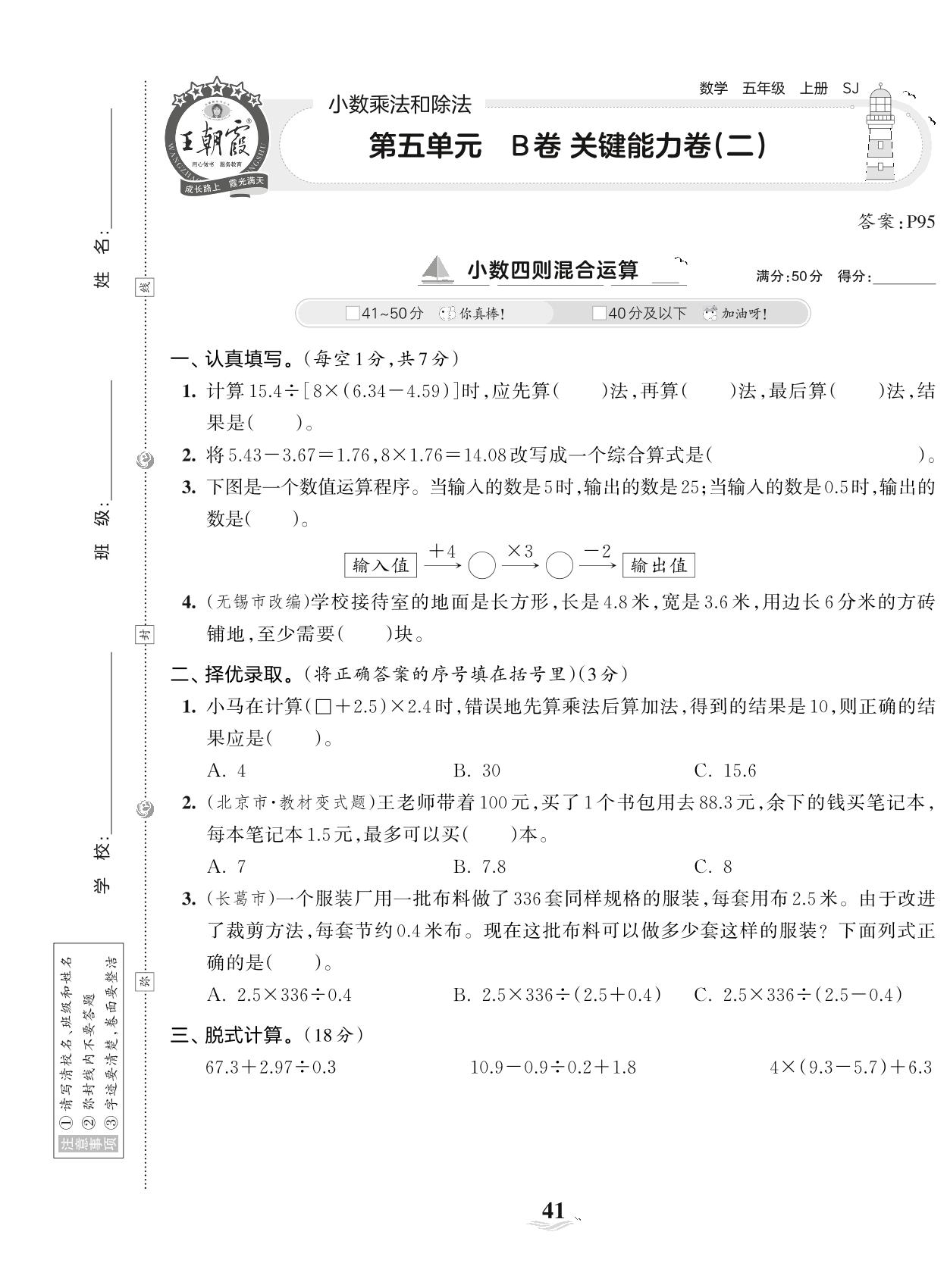 2023上册五年级数学苏教版 第五单元 B卷 关键能力卷(二)