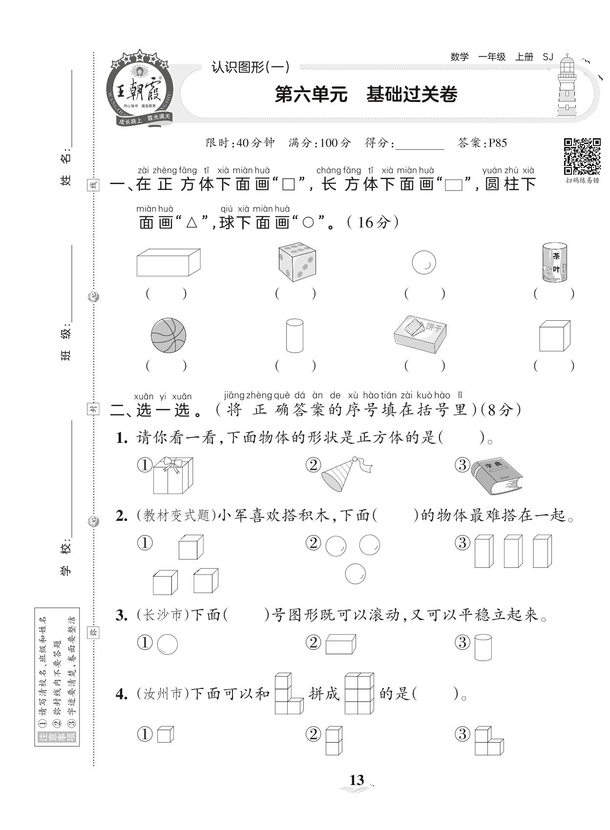 2023上册一年级数学苏教版 第六单元 基础过关卷