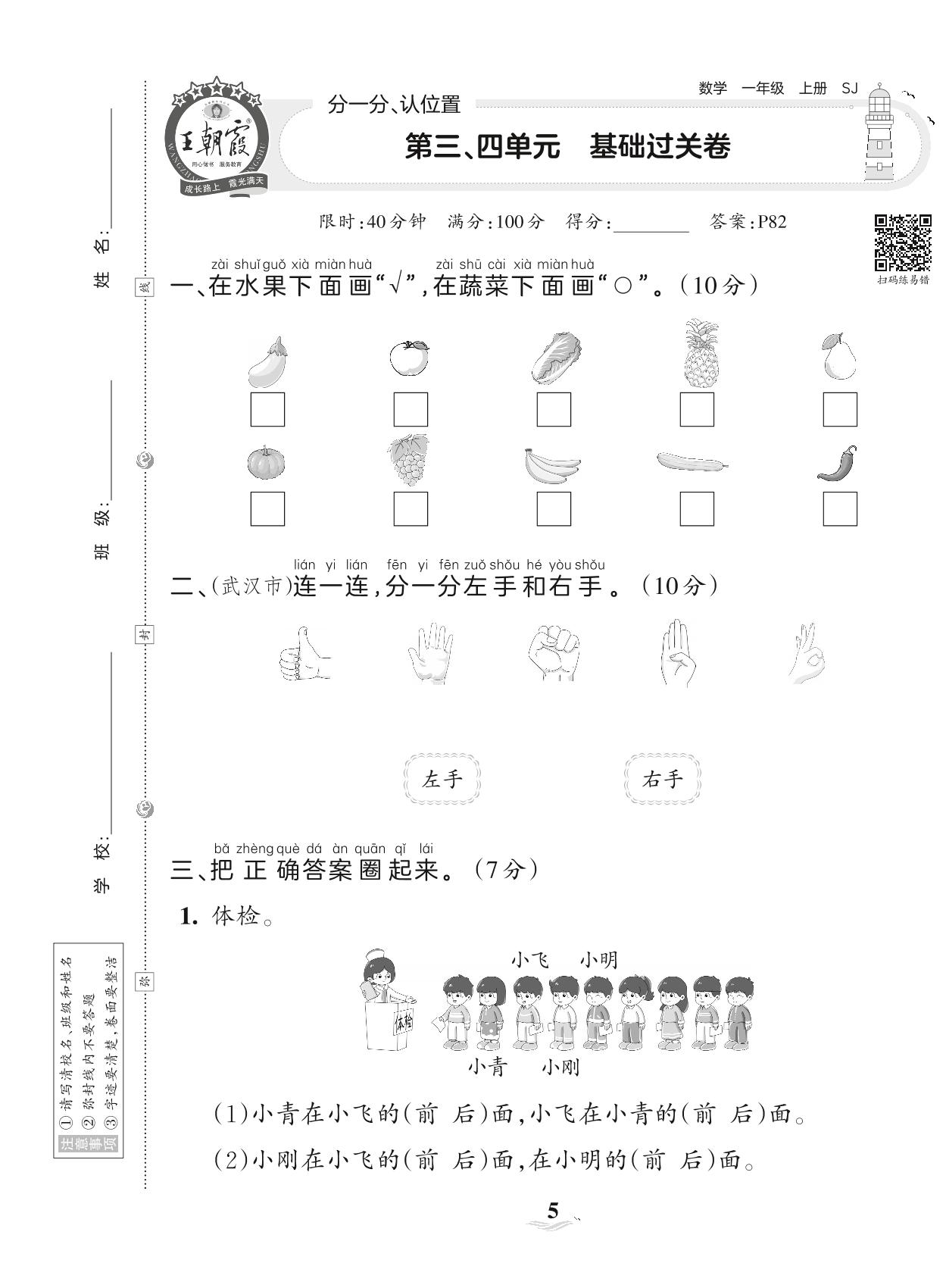 2023上册一年级数学苏教版 第三、四单元 基础过关卷