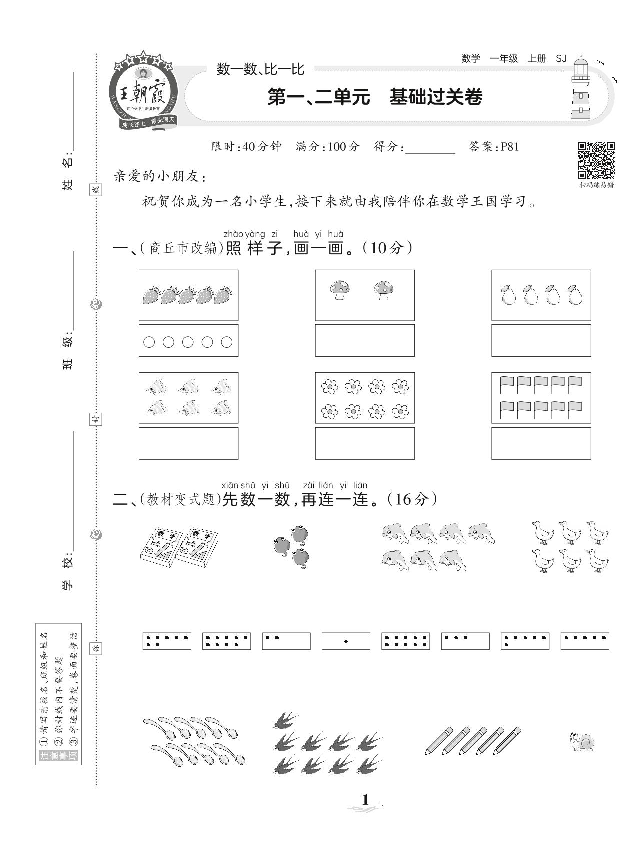 2023上册一年级数学苏教版 第一、二单元 基础过关卷