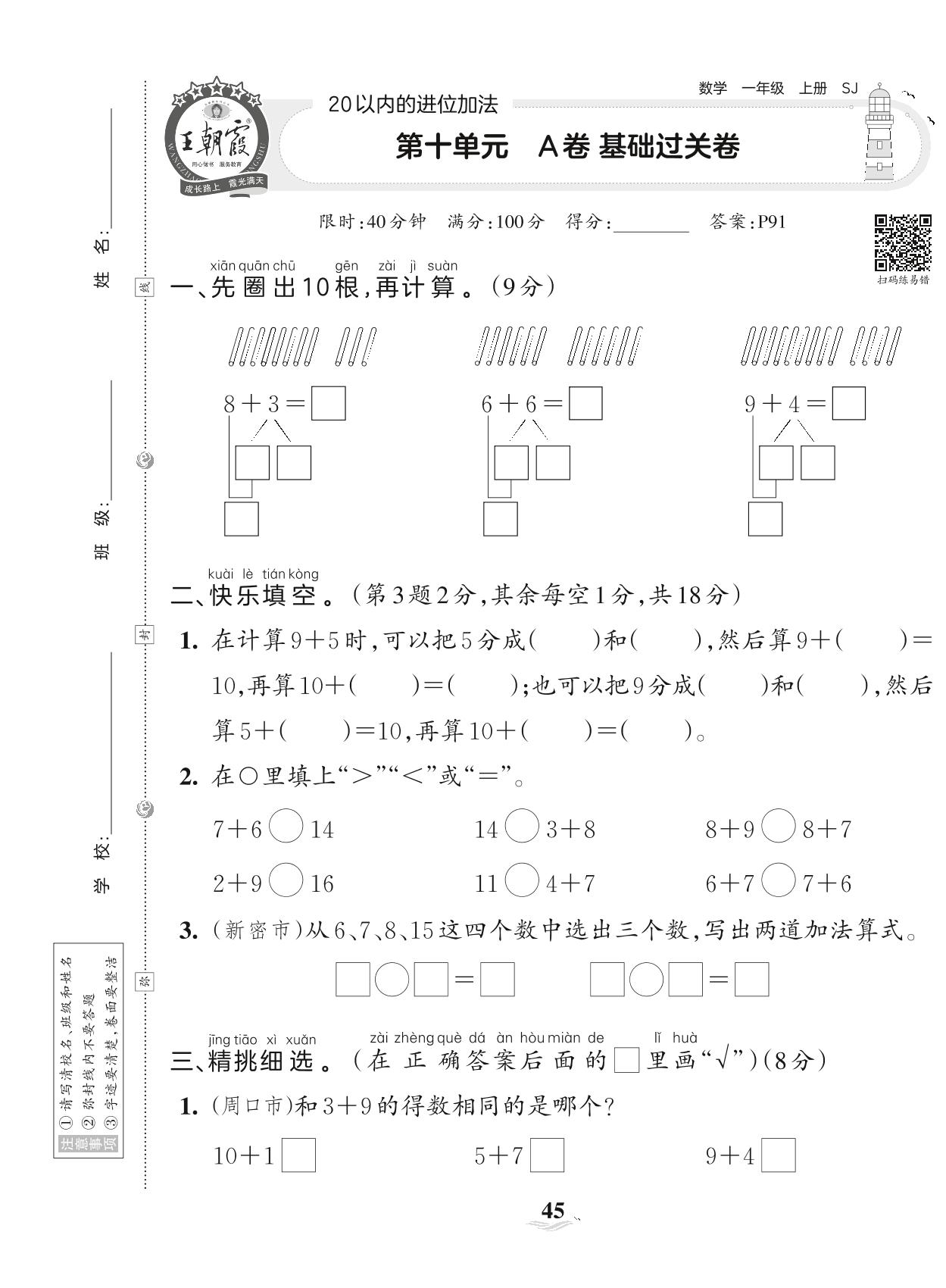 2023上册一年级数学苏教版 第十单元 A卷 基础过关卷