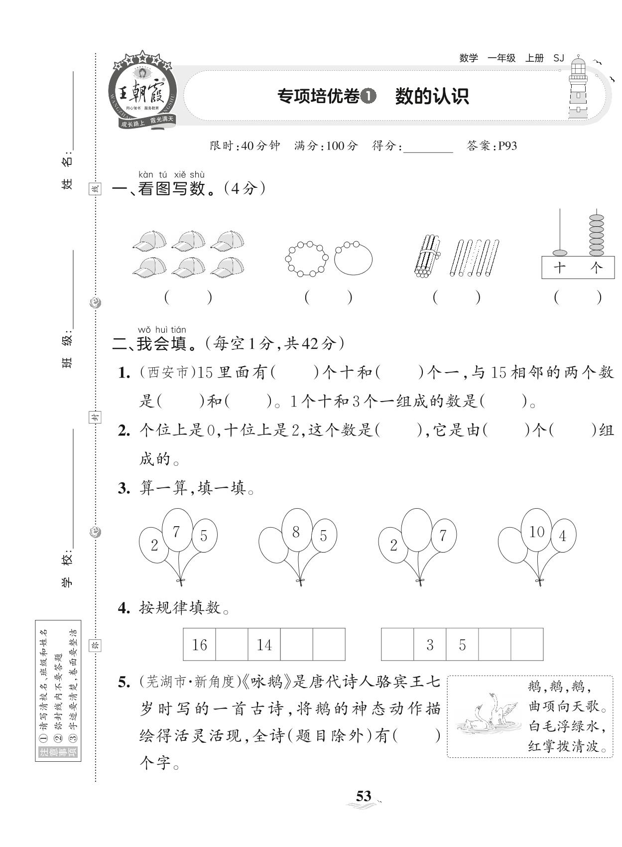 2023上册一年级数学苏教版 专项培优卷1 数的认识