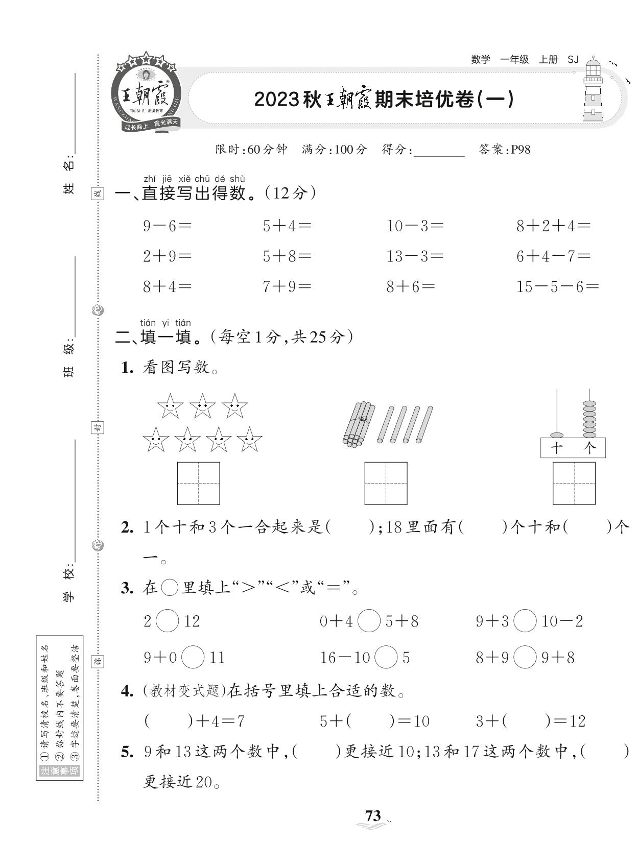 2023上册一年级数学苏教版 2023秋王朝霞期末培优卷(一)