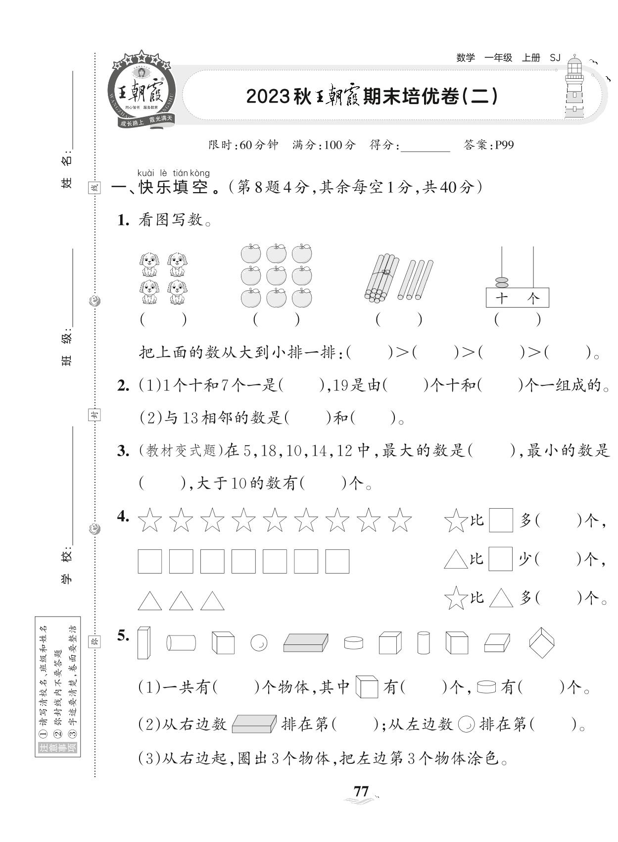 2023上册一年级数学苏教版 2023秋王朝霞期末培优卷(二)