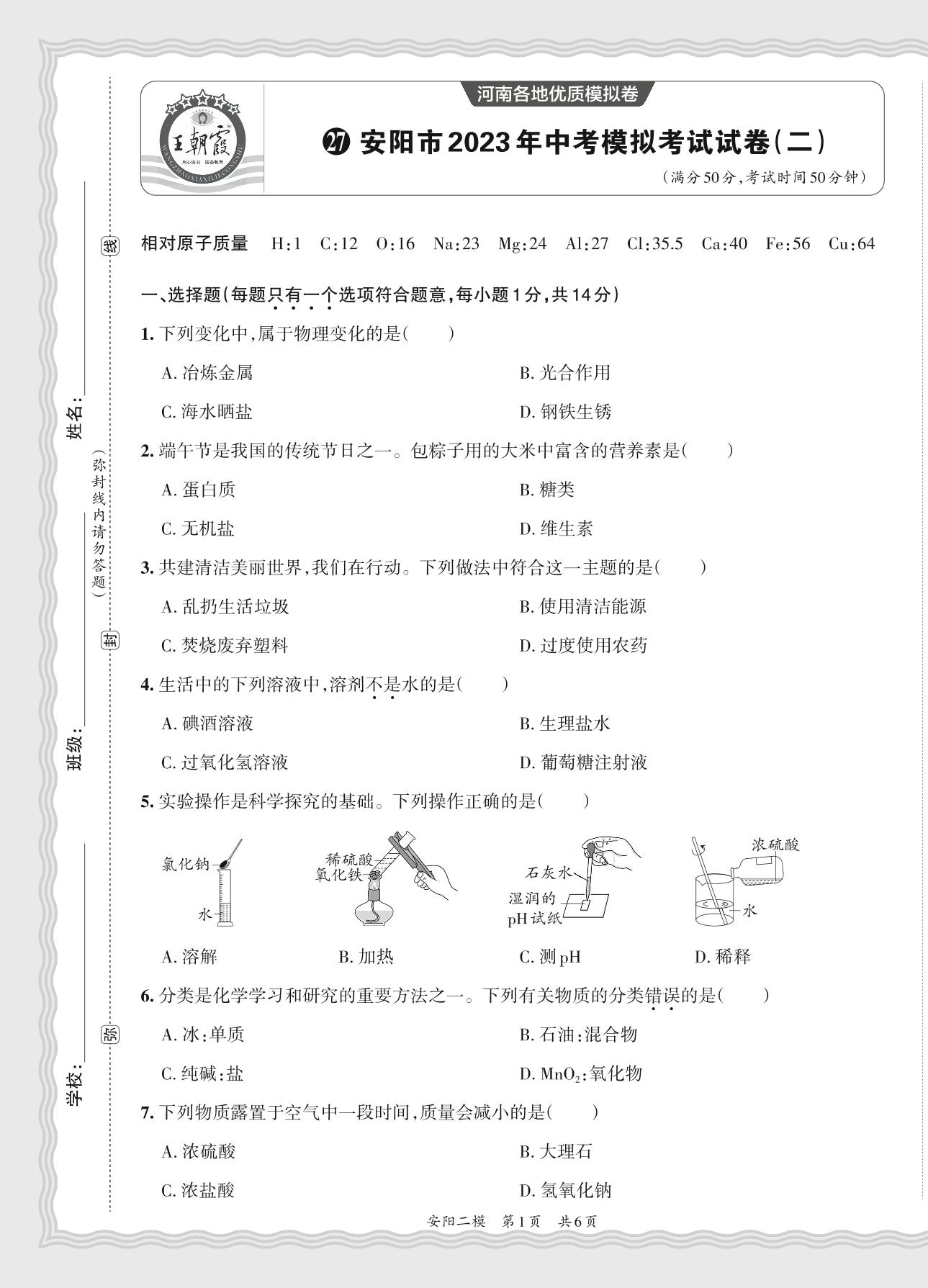 安阳市2023年中考模拟考试试卷(二)·化学【27】