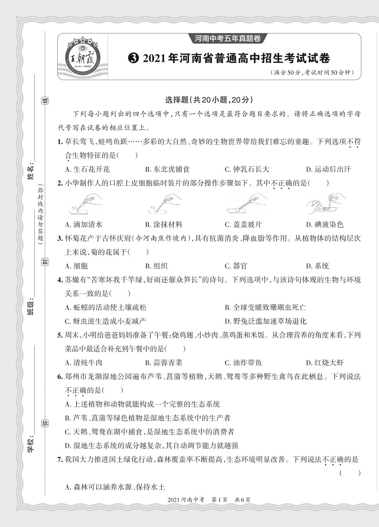 2021年河南省普通高中招生考试试卷·生物【3】