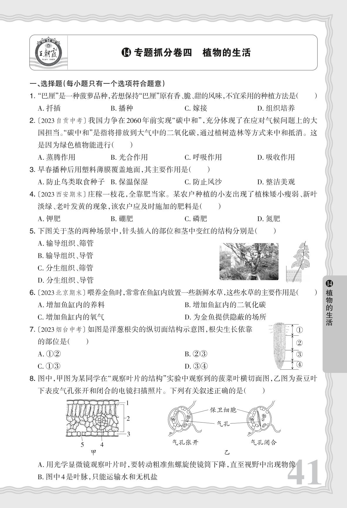 河南中考专题抓分卷四 植物的生活·生物【14】