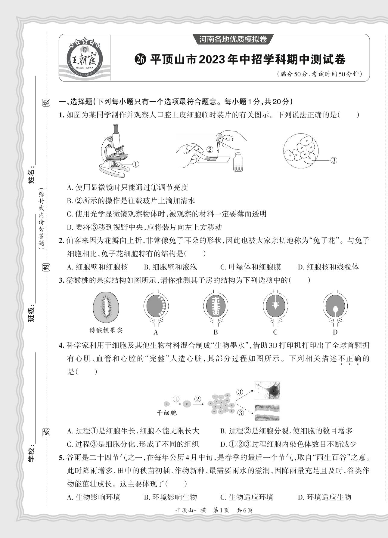 平顶山市2023年中招学科期中测试卷·生物【26】