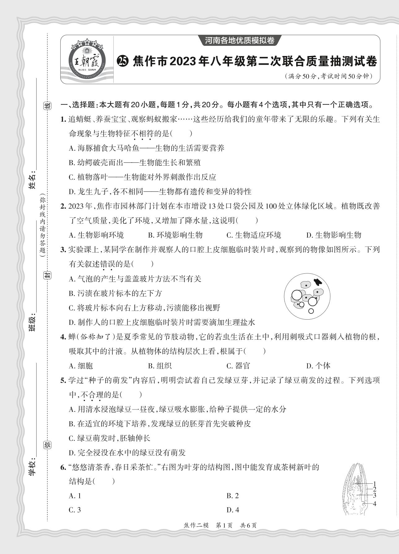 焦作市2023年八年级第二次联合质量抽测试卷·生物【25】