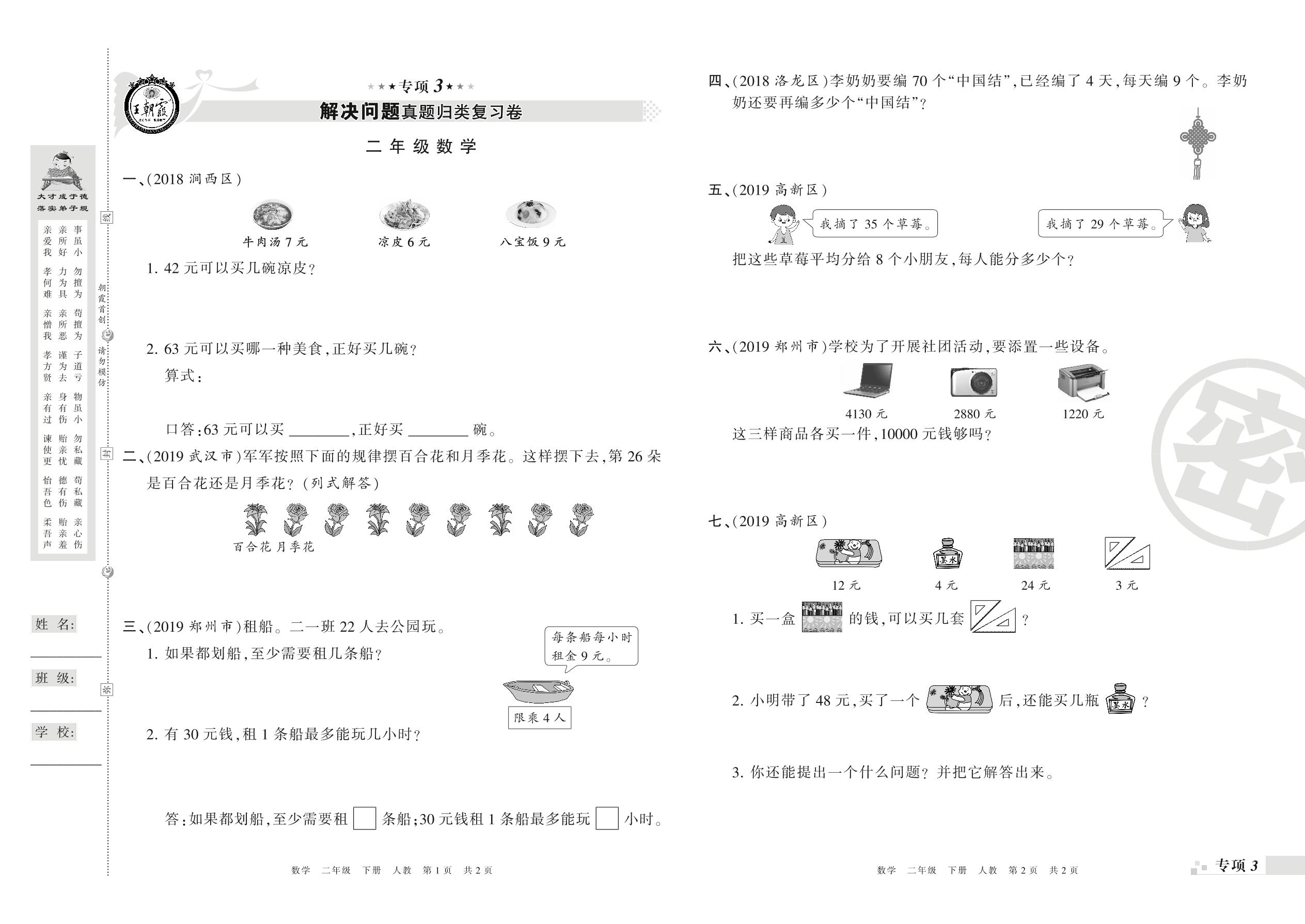 王朝霞期末专项卷——解决问题真题归类复习卷、新颖题速递:生活与数学二年级下册数学(人教版)_R21080391442【0】