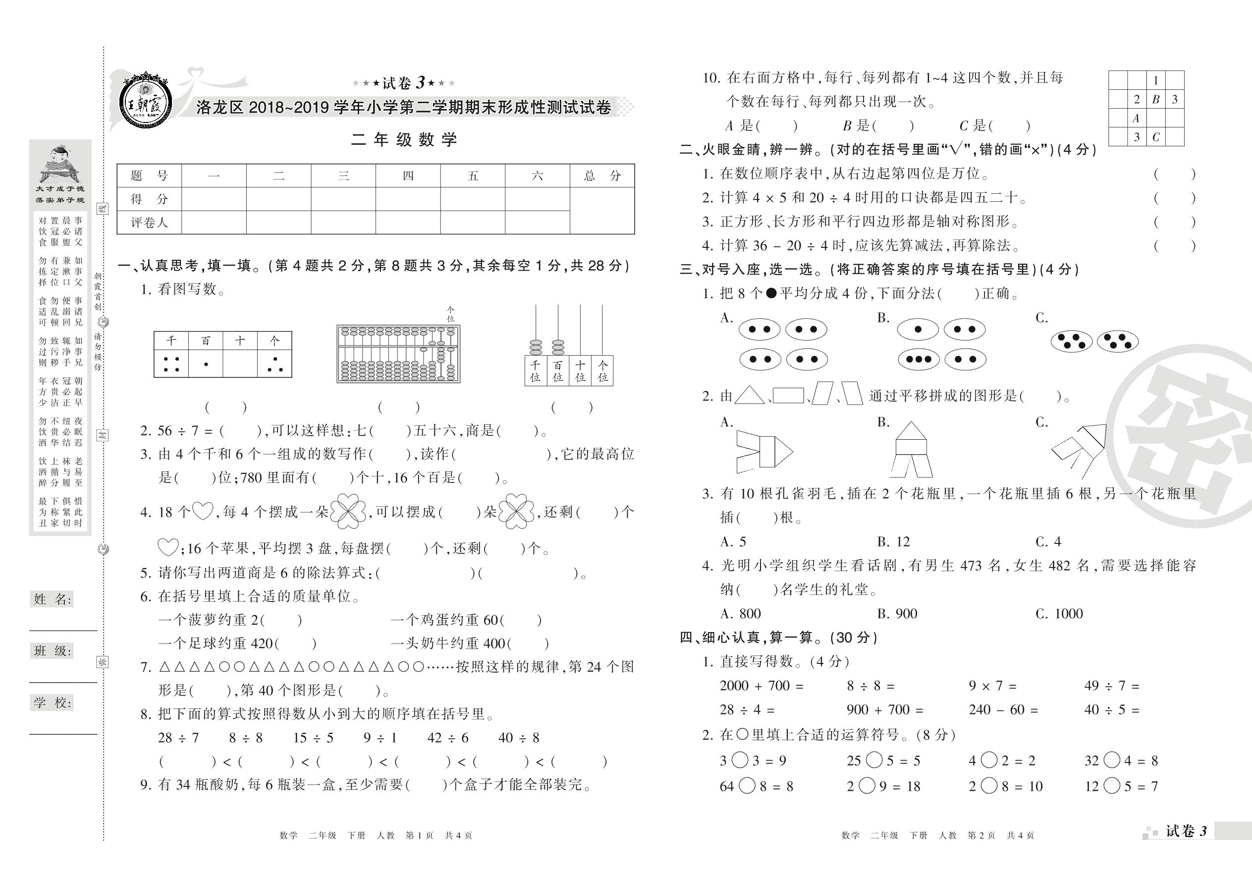 2018-2019学年第二学期洛阳市洛龙区二年级数学试卷(人教版)【3】