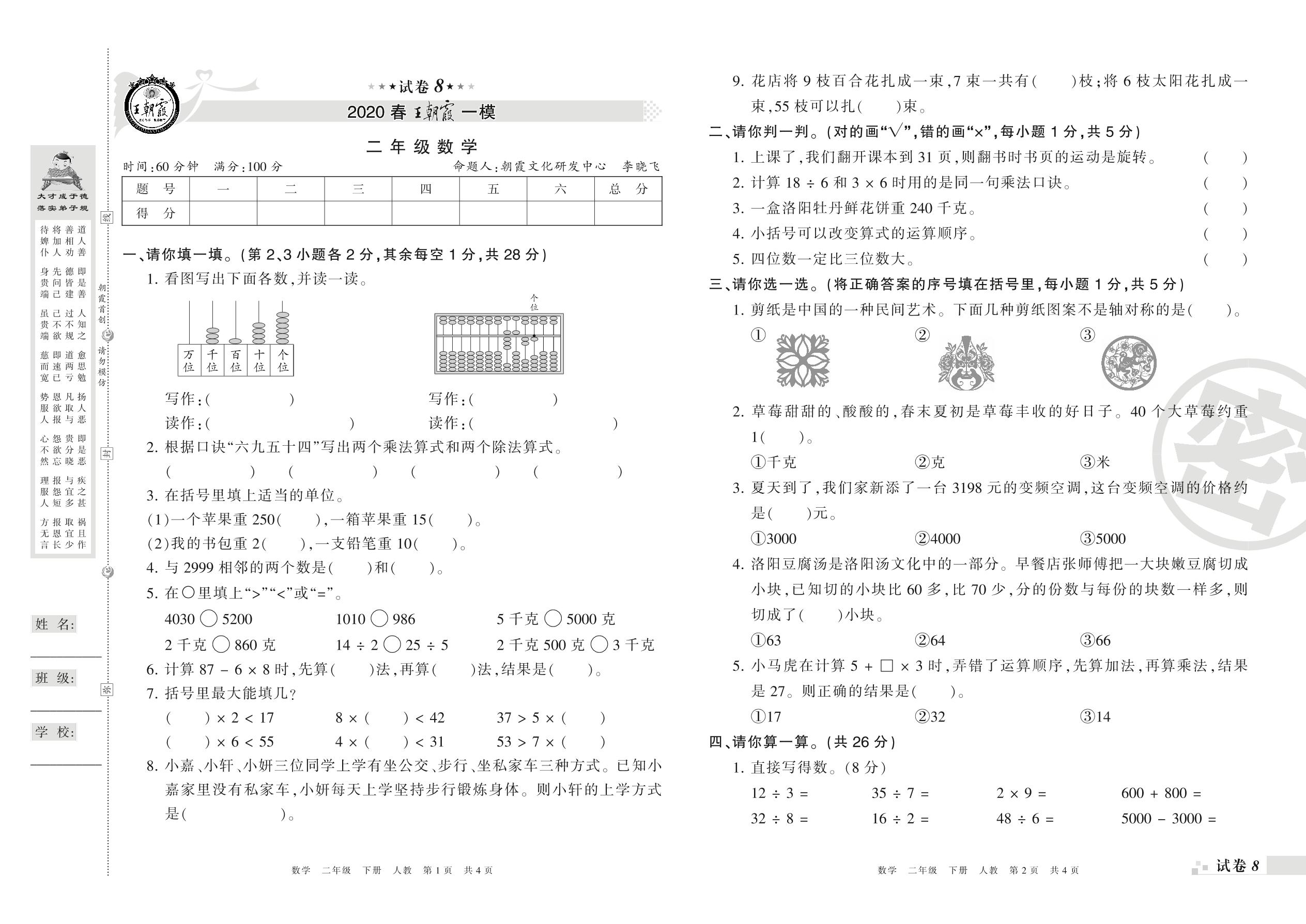 王朝霞期末模拟卷二年级下册数学(人教版)_R21080391533【8】