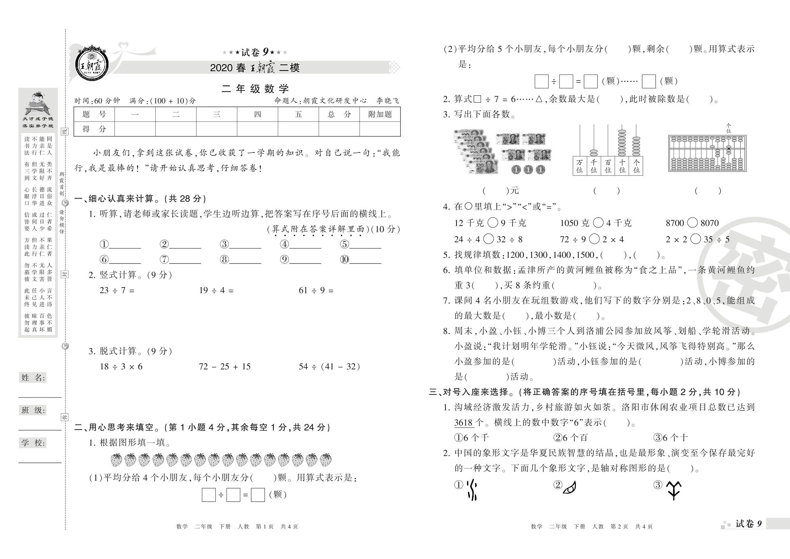 王朝霞期末模拟卷二年级下册数学(人教版)_R21080391541【9】