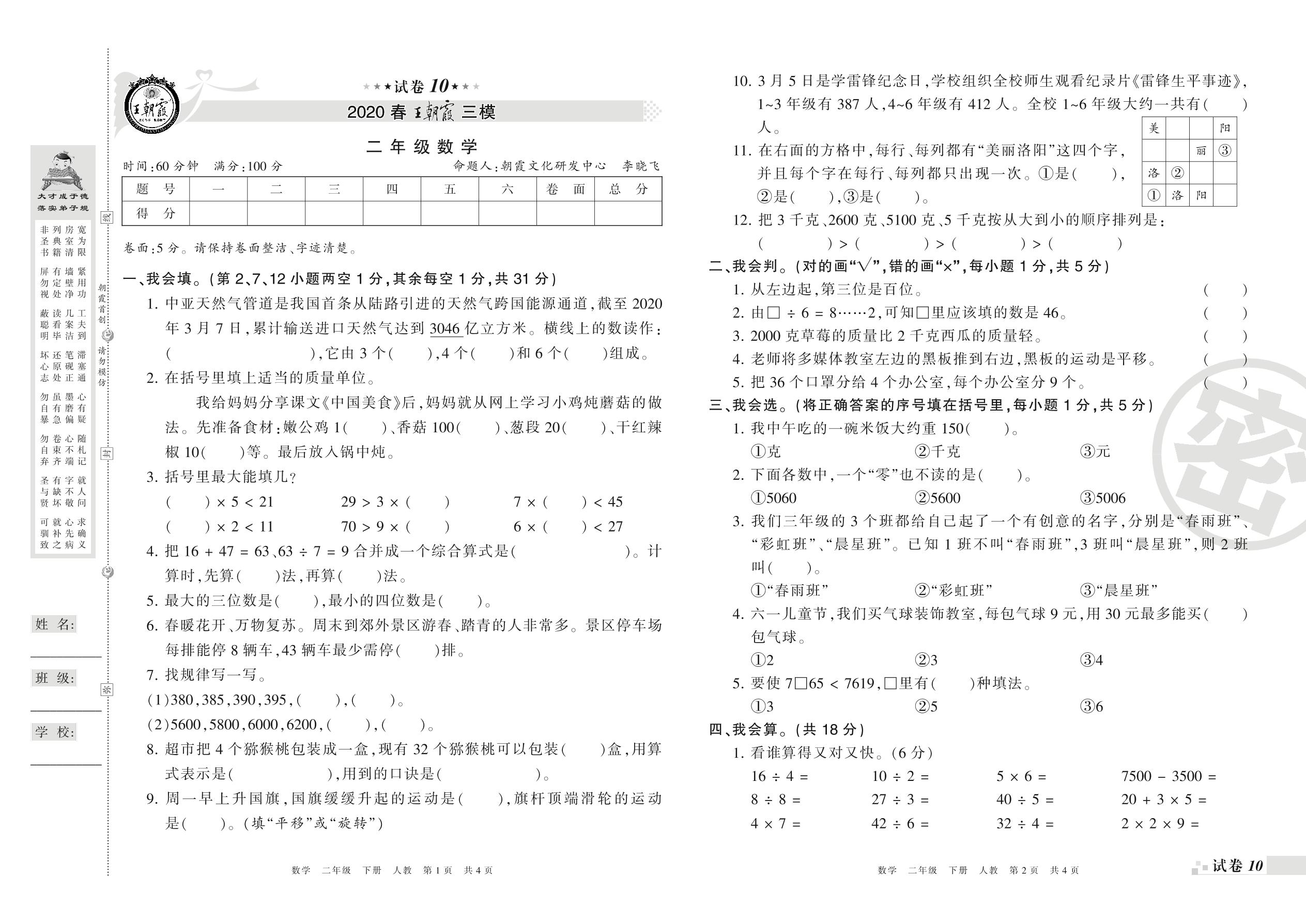 王朝霞期末模拟卷二年级下册数学(人教版)_R21080391550【10】