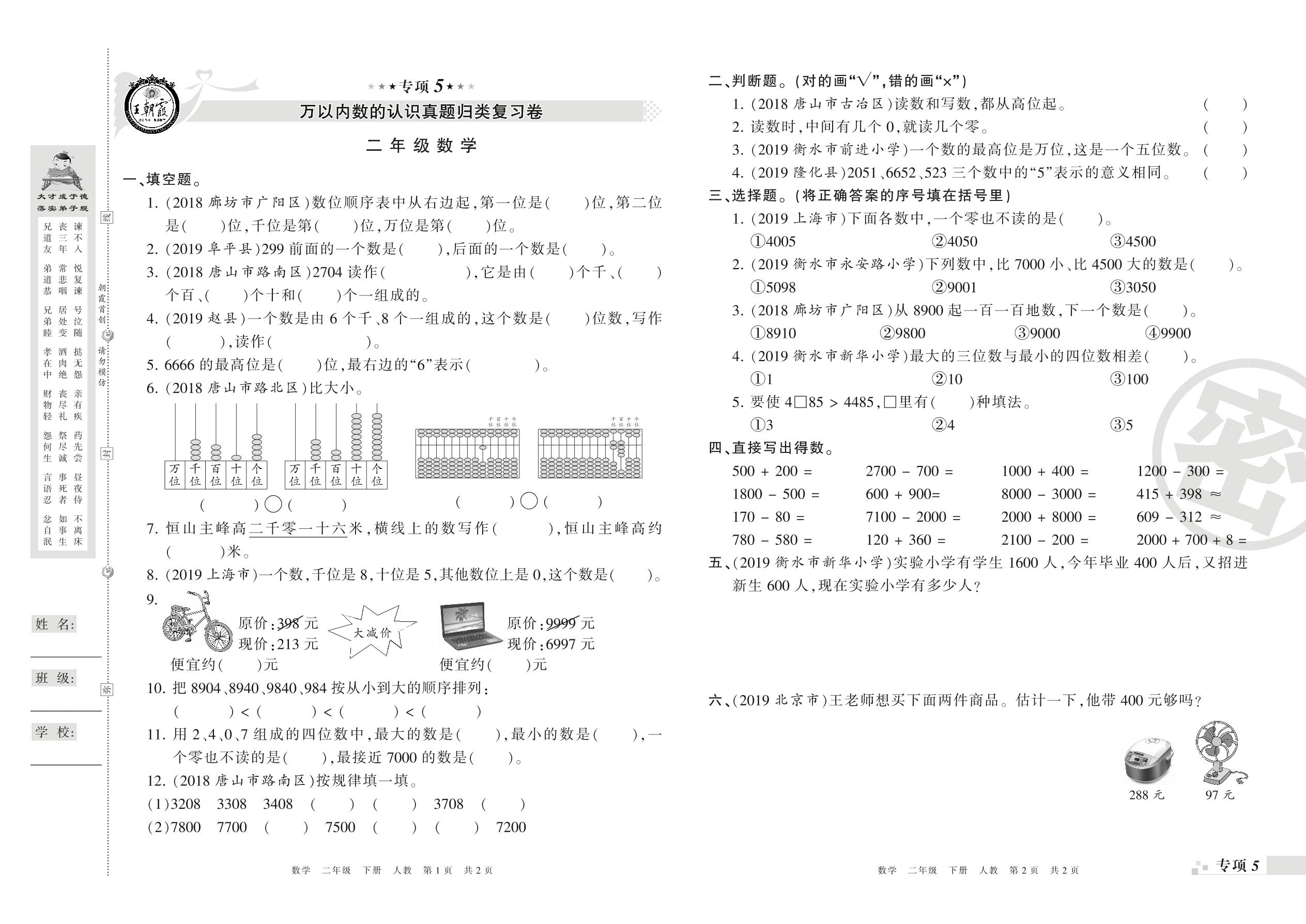 王朝霞期末专项卷——万以内数的认识、数据收集整理及图形的运动真题归类复习卷二年级下册数学(人教版)_R21080391606【0】