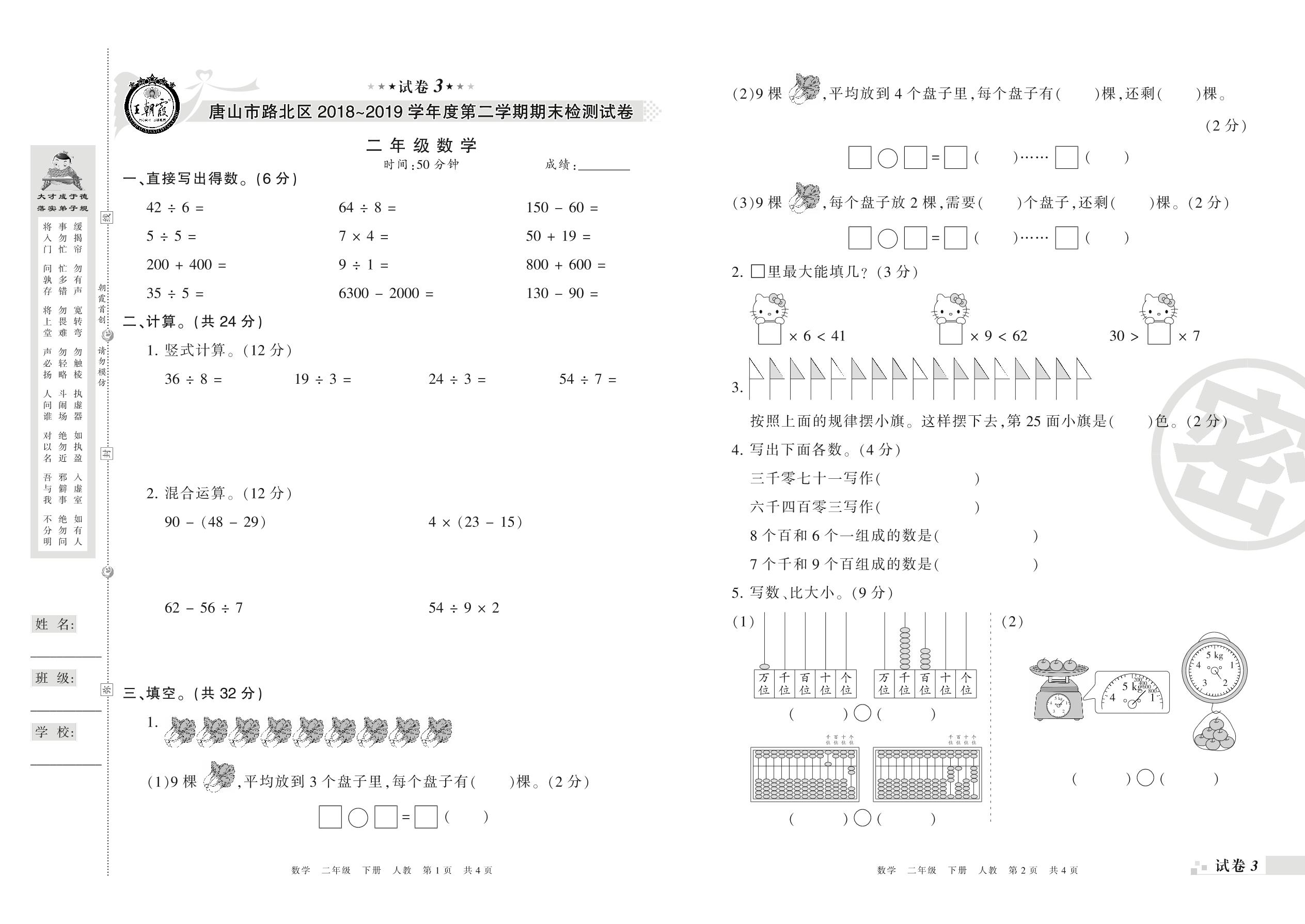 2018-2019学年第二学期唐山市路北区二年级数学试卷(人教版)【3】
