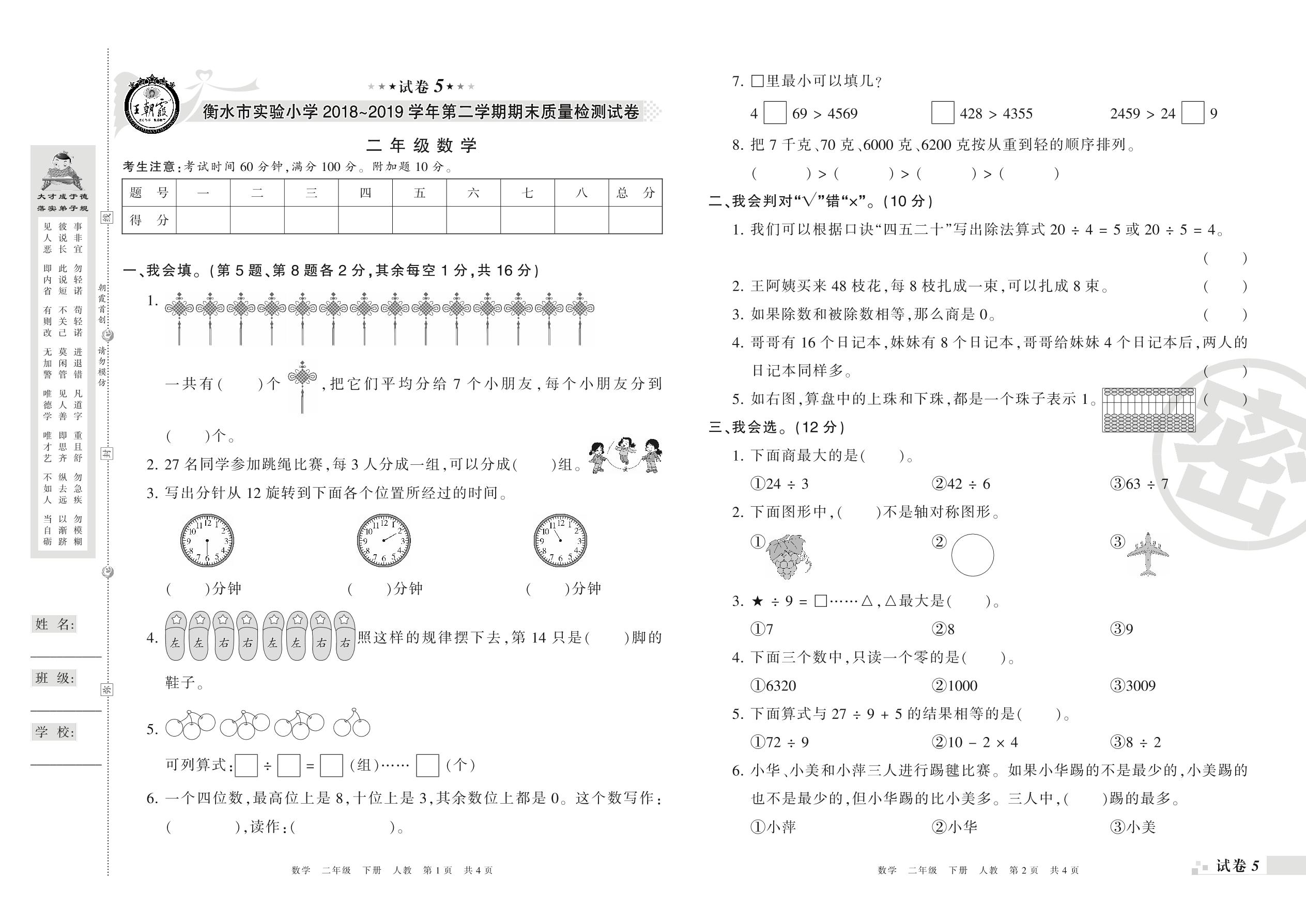2018-2019学年第二学期衡水市实验小学二年级数学试卷(人教版)【5】