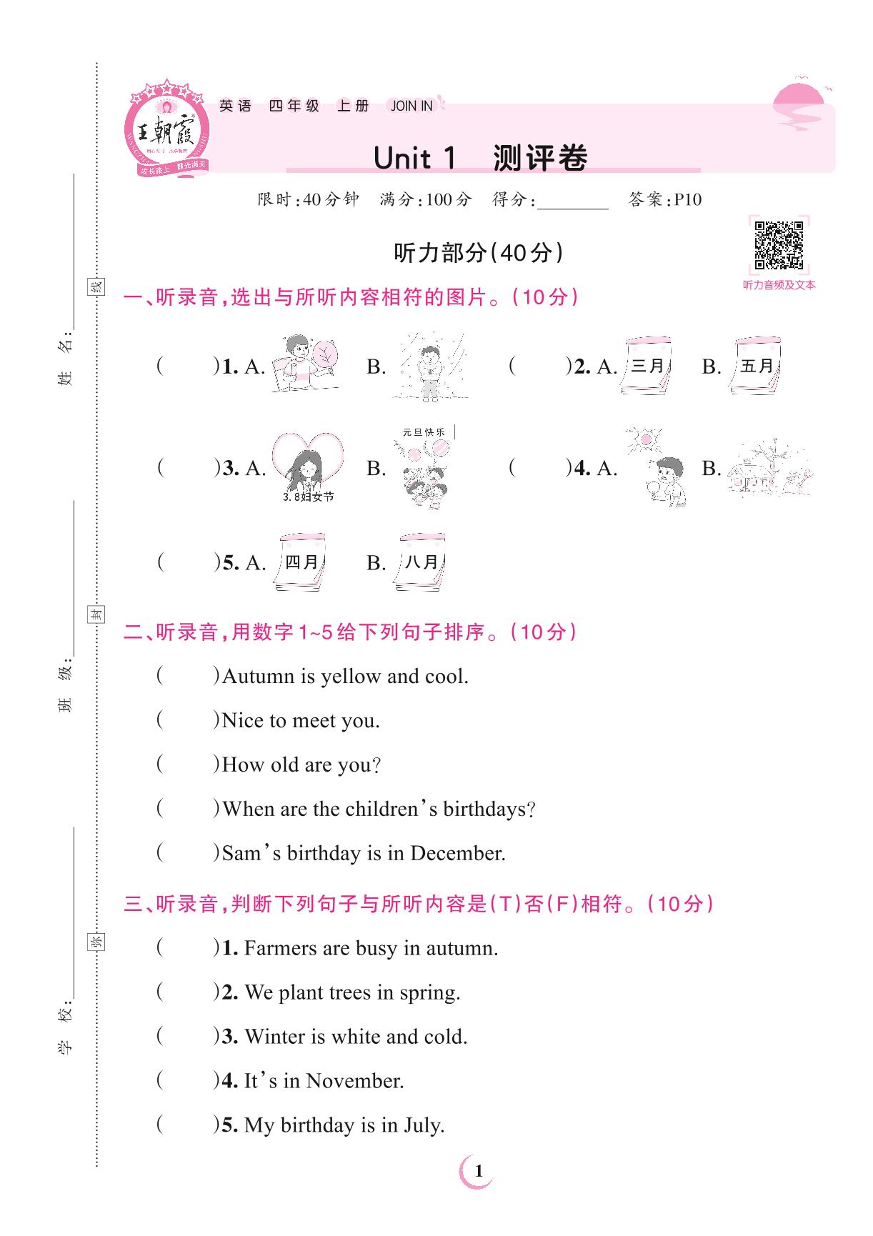 2023上册四年级英语剑桥版 Unit 1 测评卷