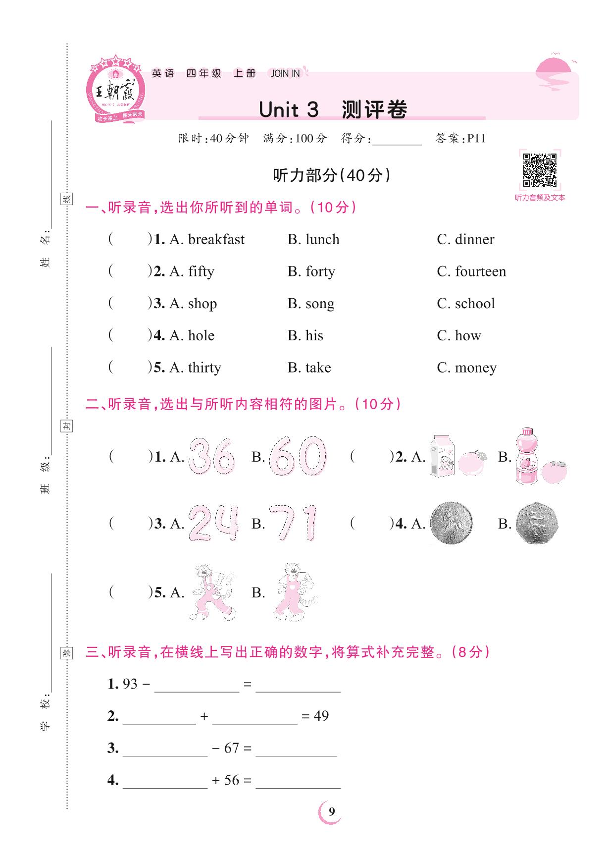 2023上册四年级英语剑桥版 Unit 3 测评卷