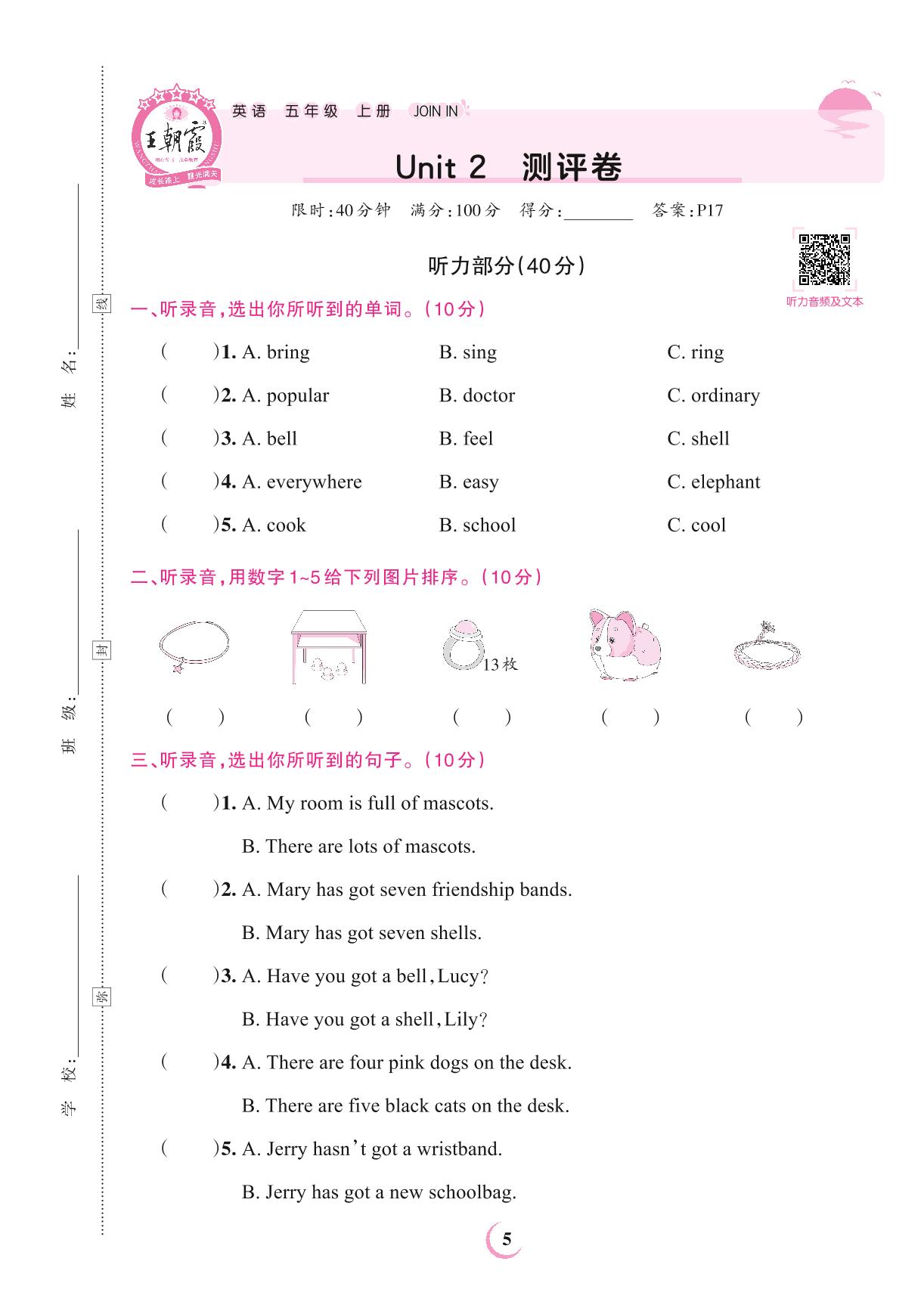 2023上册五年级英语剑桥版 Unit 2 测评卷