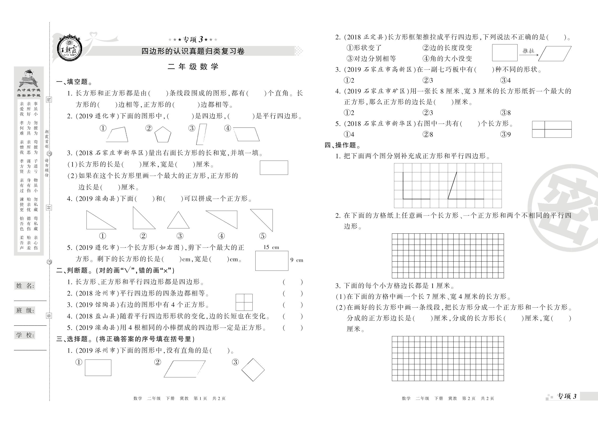 王朝霞期末专项卷——四边形的认识、三位数加减三位数(一)真题归类复习卷二年级下册数学(冀教版)_R21080391706【0】