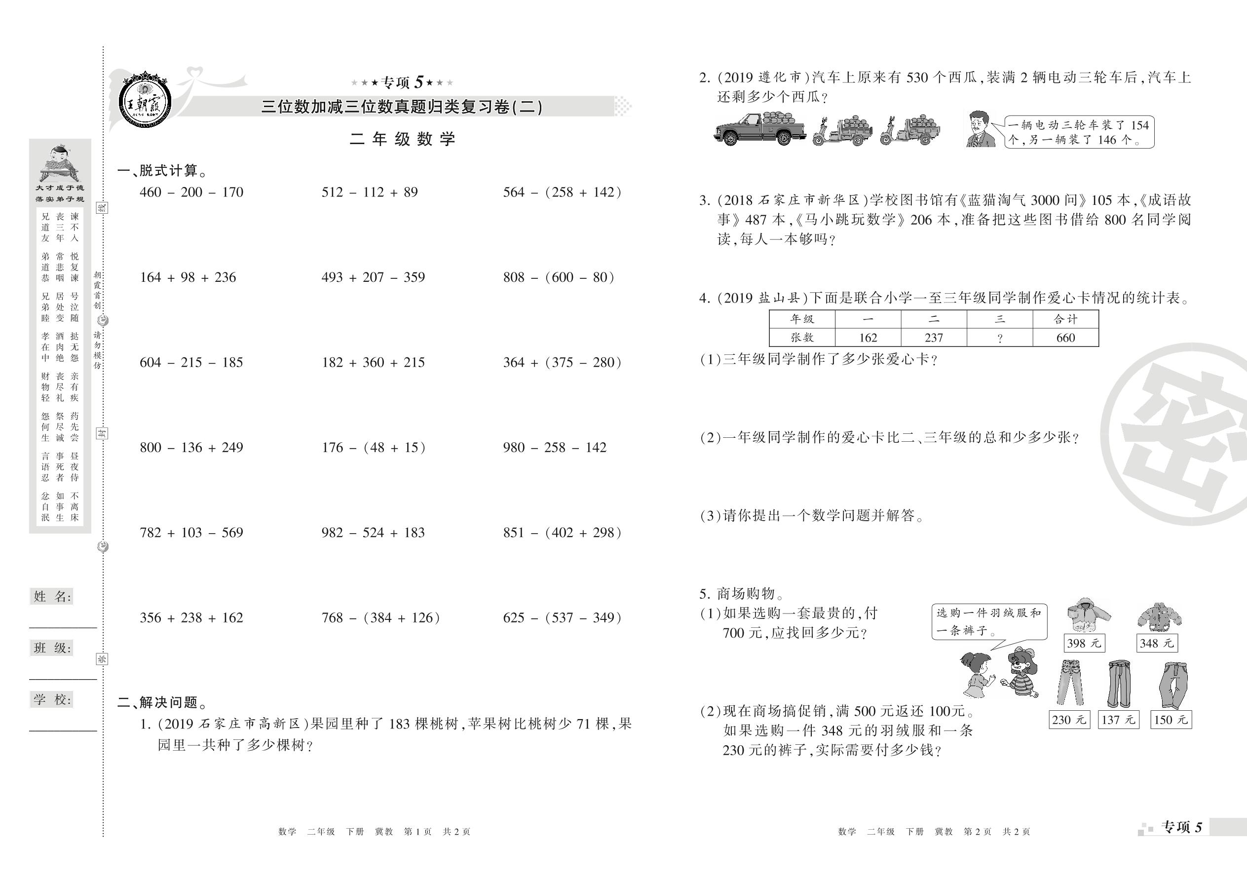 王朝霞期末专项卷——三位数加减三位数(二)、时、分、秒真题归类复习卷二年级下册数学(冀教版)_R21080391708【0】