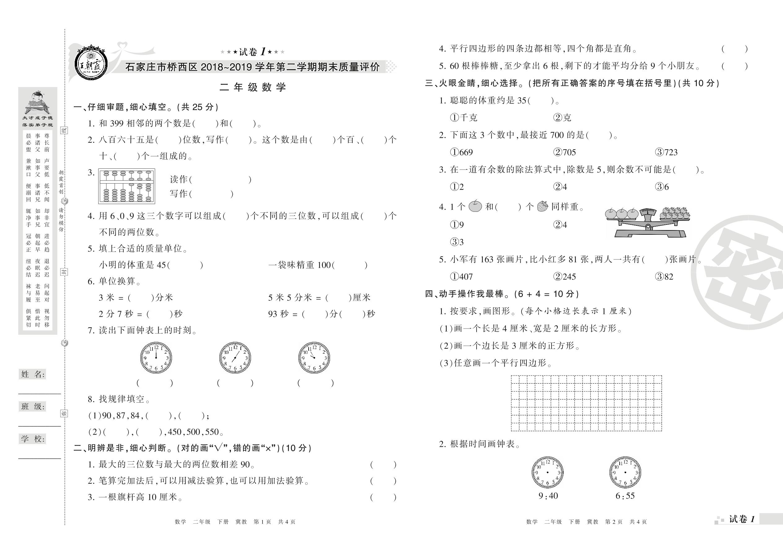 2018-2019学年第二学期石家庄市桥西区二年级数学试卷(冀教版)【1】