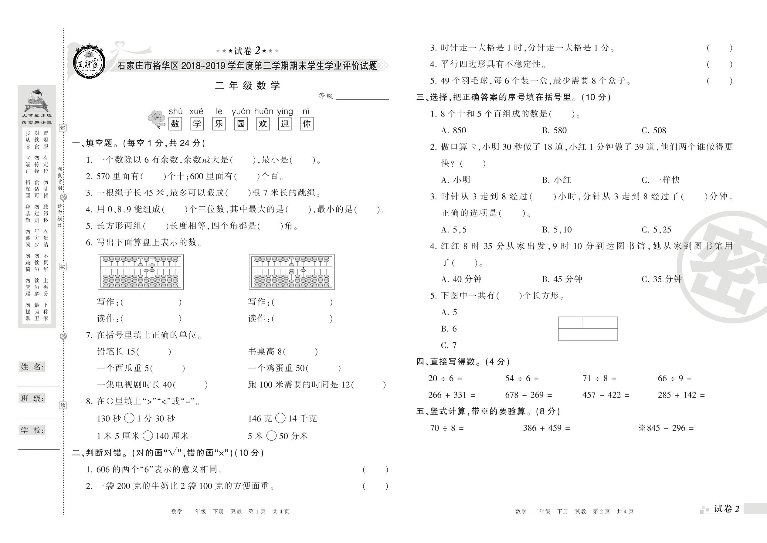 2018-2019学年第二学期石家庄市裕华区二年级数学试卷(冀教版)【2】