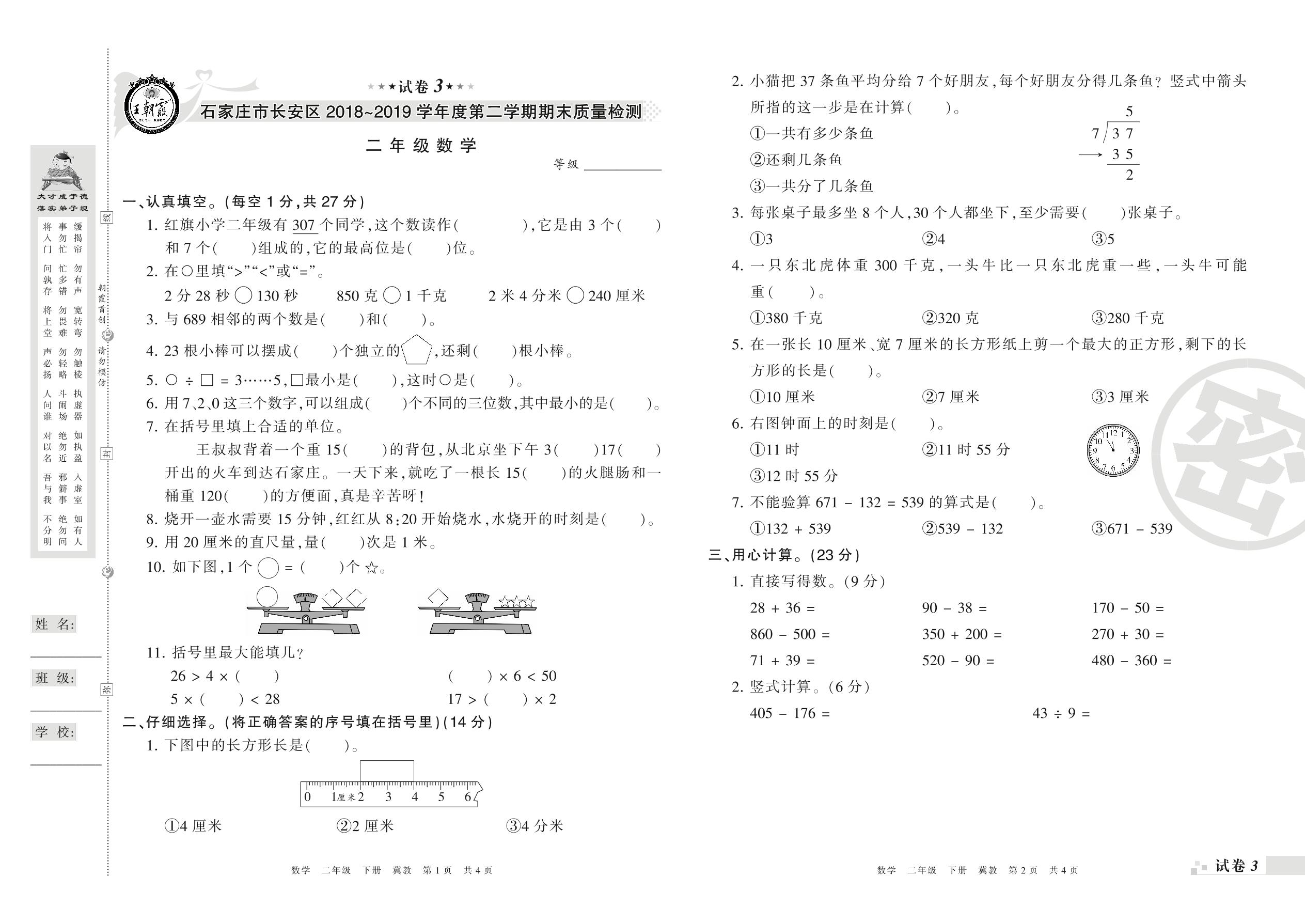 2018-2019学年第二学期石家庄市长安区二年级数学试卷(冀教版)【3】