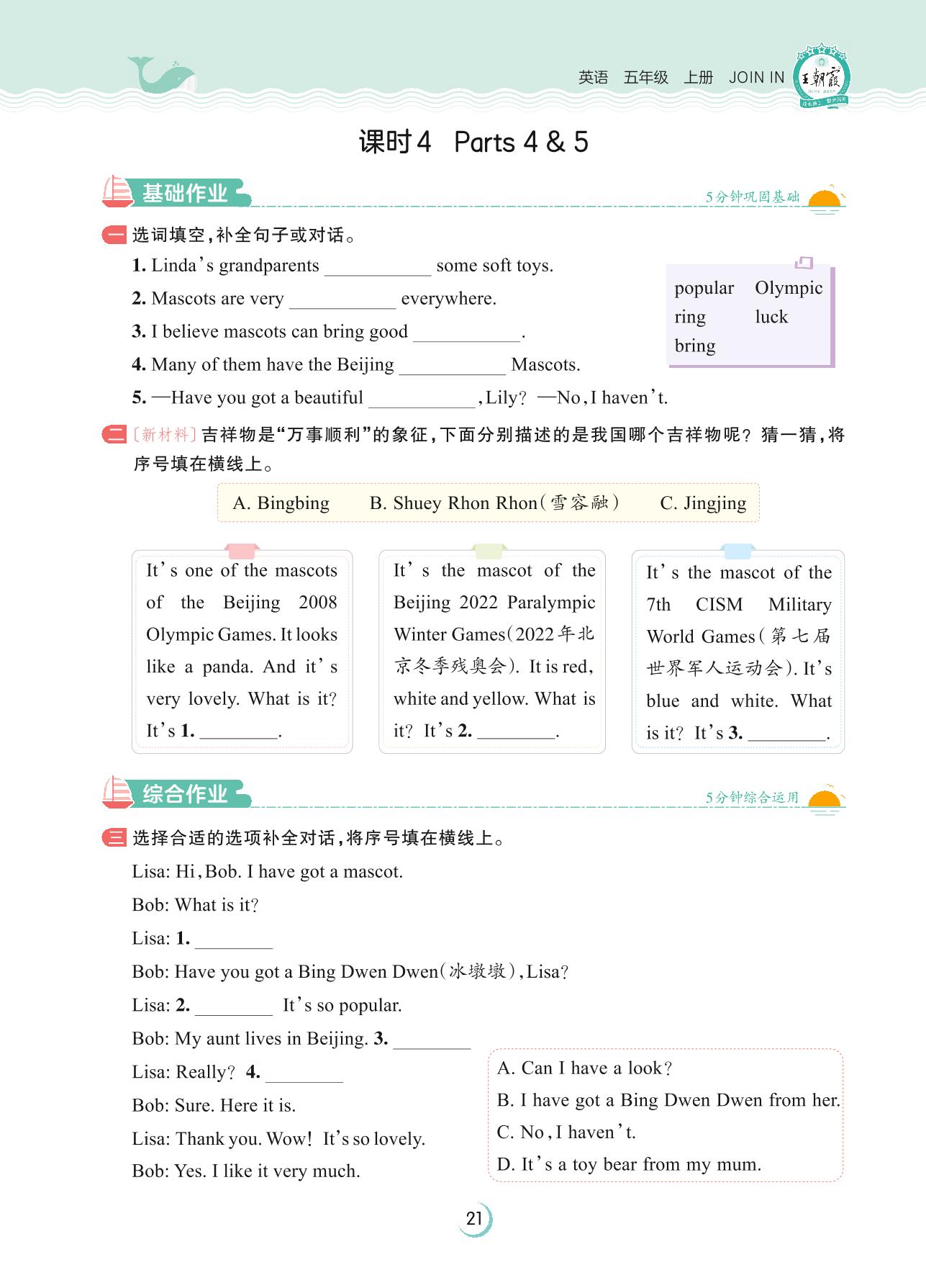 2023上册五年级英语剑桥版 Unit 2—课时 4 Parts 4 & 5