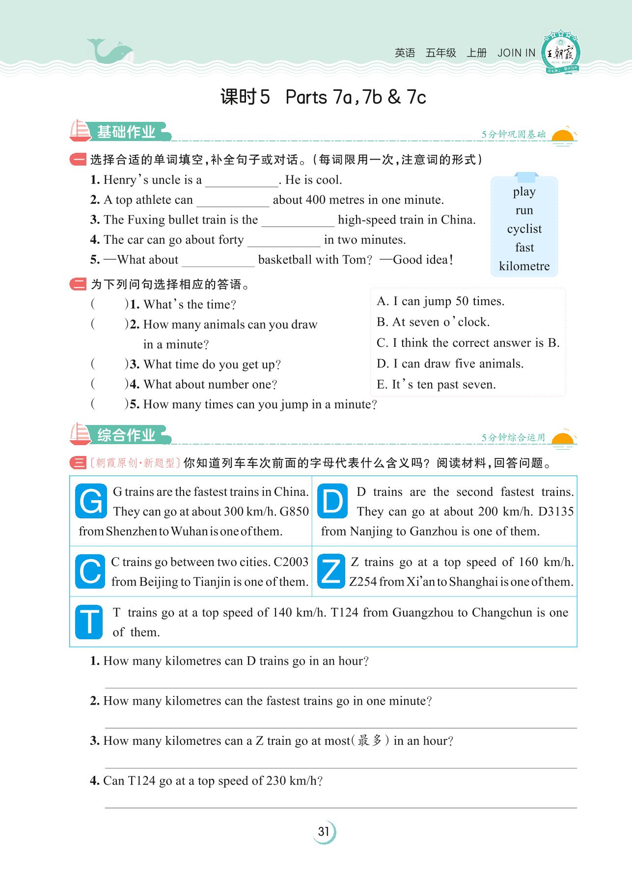 2023上册五年级英语剑桥版 Unit 3 Time—课时 5 Parts 7a,7b & 7c