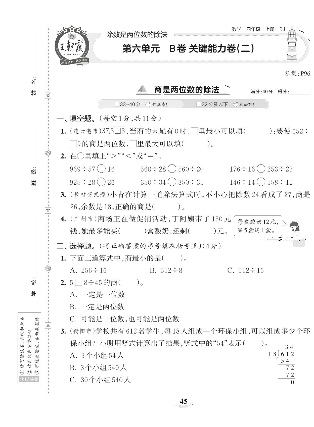 2023上册四年级数学人教版 第六单元 B卷 关键能力卷(二)