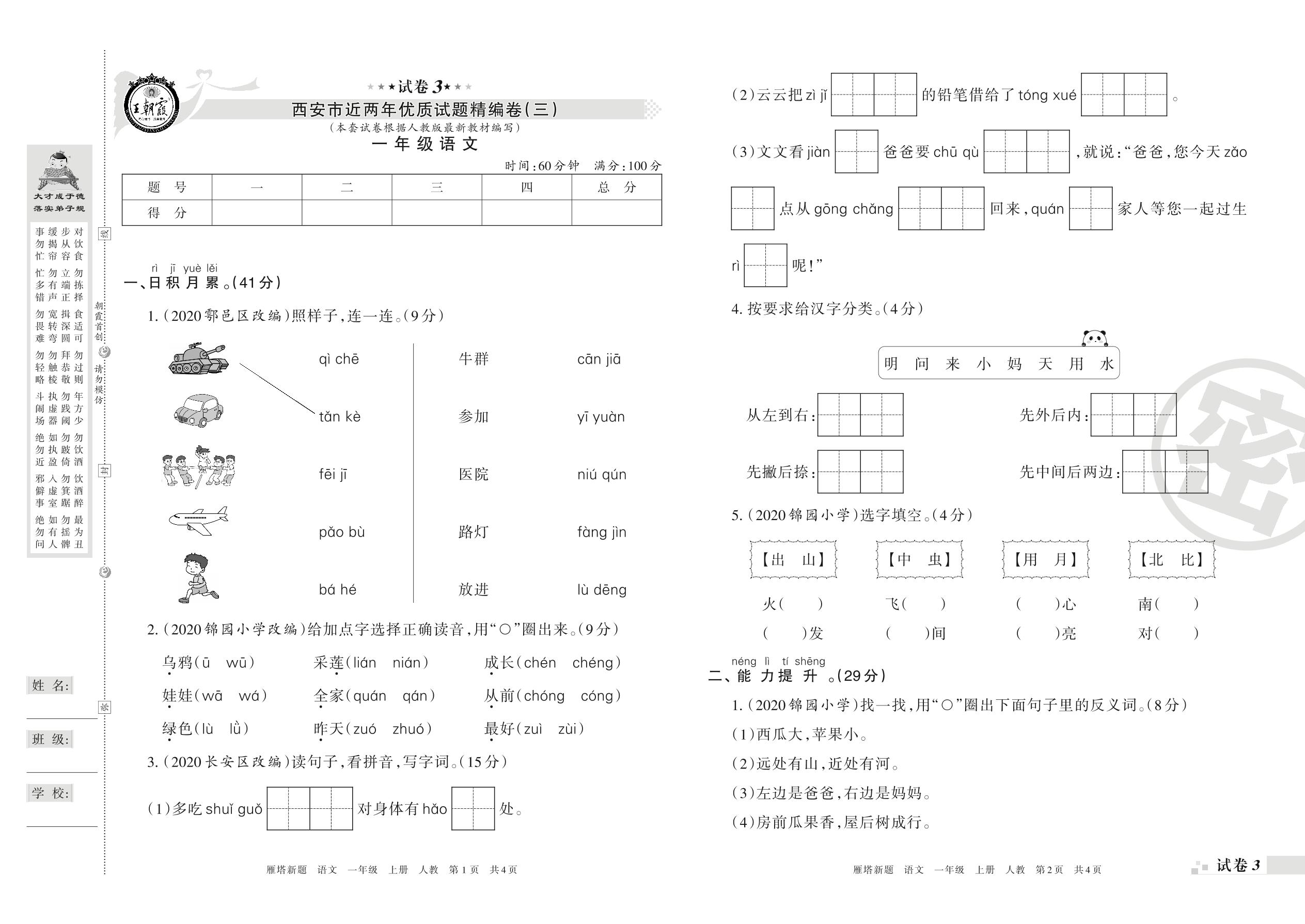 西安市近两年优质试题精编卷(三)一年级上册语文(人教版)【3】