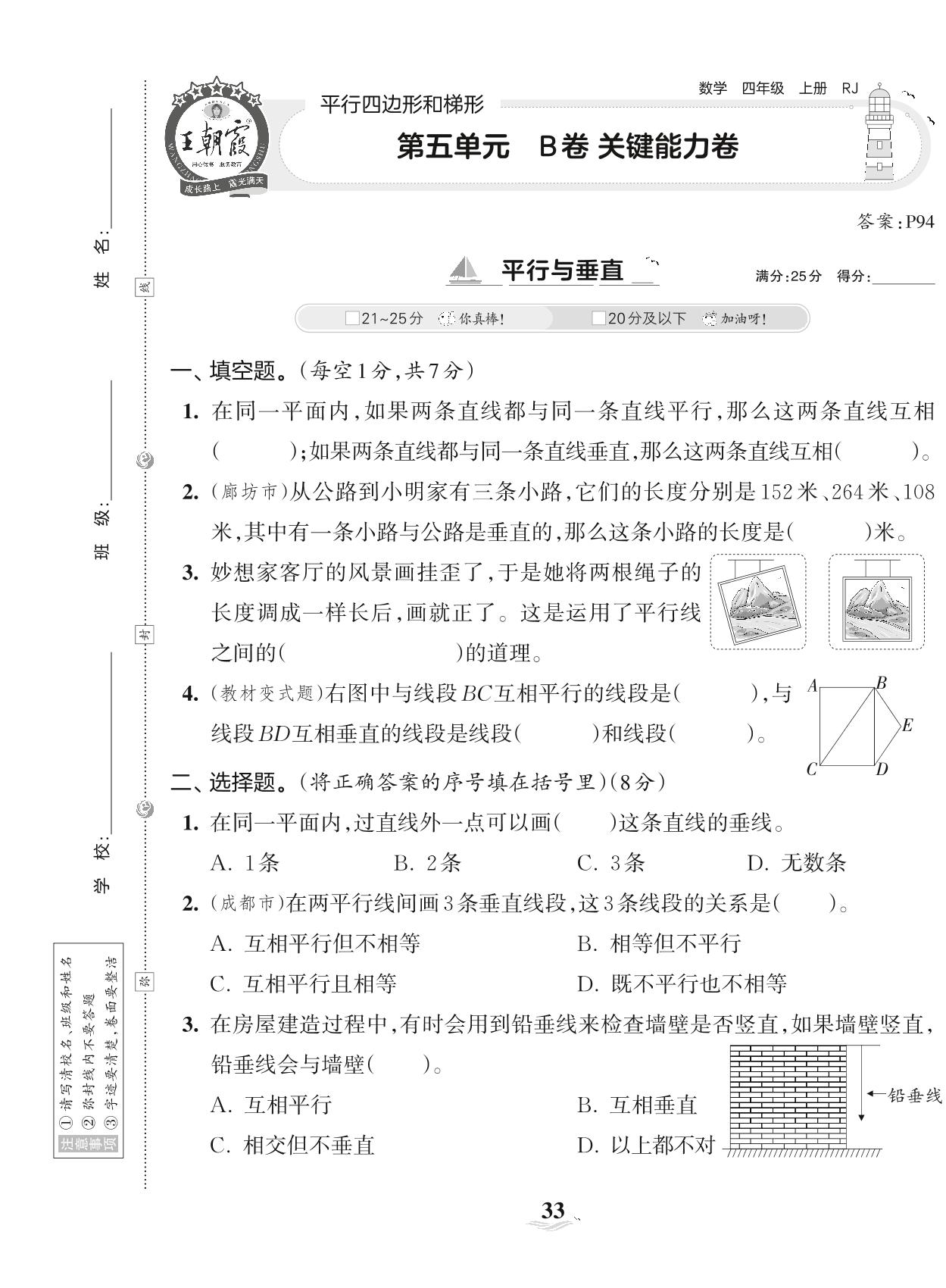 2023上册四年级数学人教版 第五单元 B卷 关键能力卷