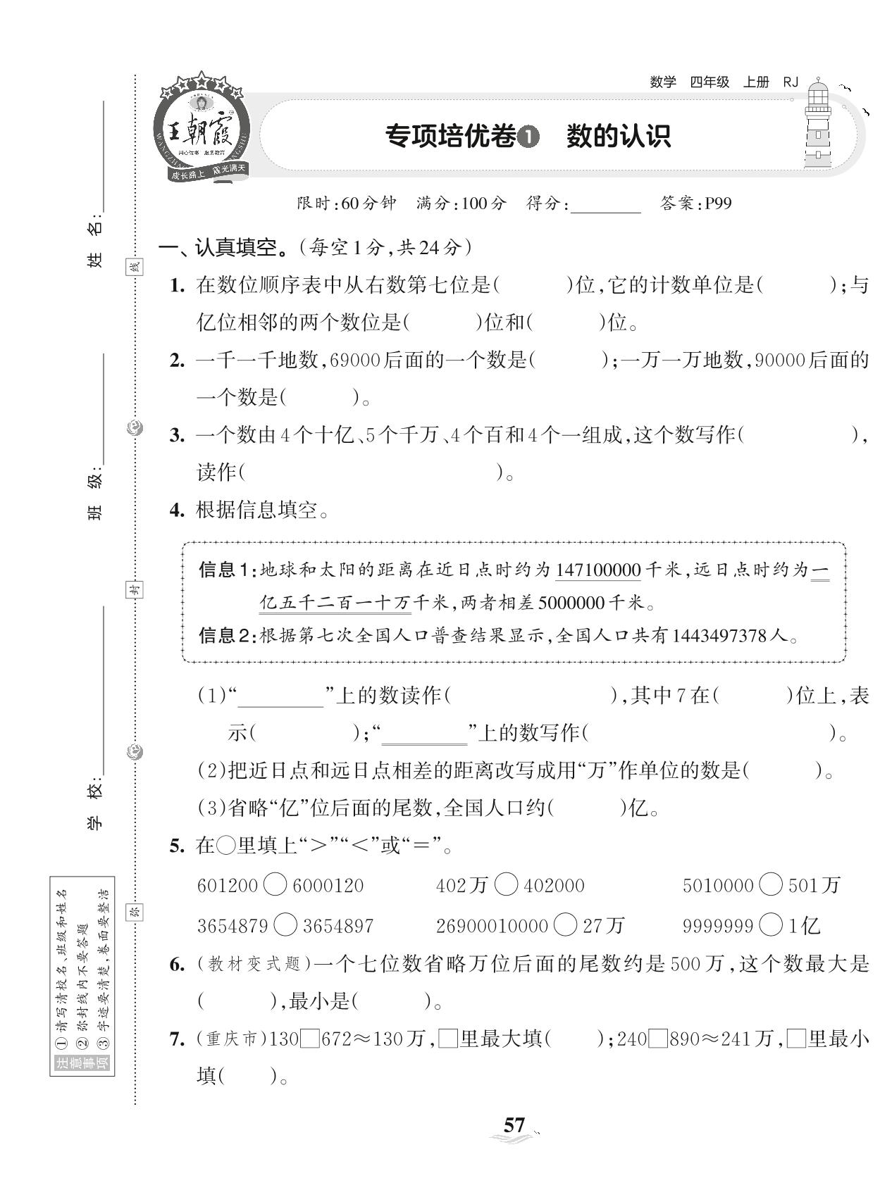 2023上册四年级数学人教版 专项培优卷1 数的认识