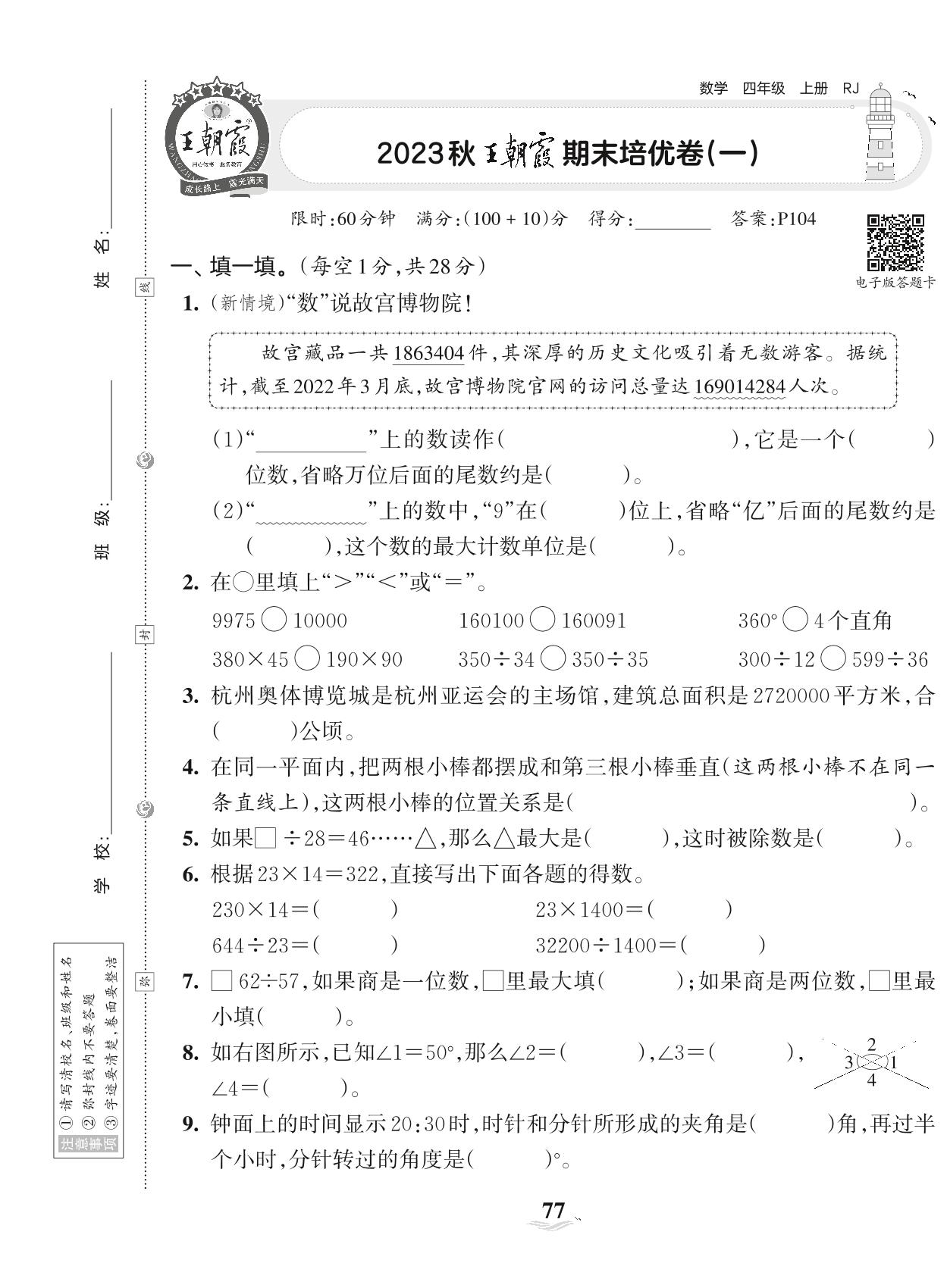 2023上册四年级数学人教版 2023秋王朝霞期末培优卷(一)