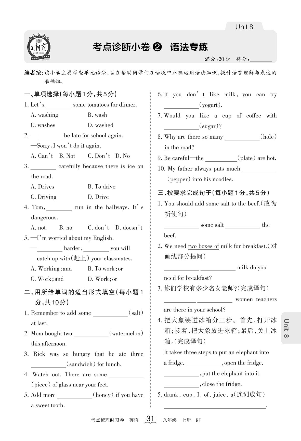 2023上册八年级英语人教版 Unit 8 考点诊断小卷2 语法专练