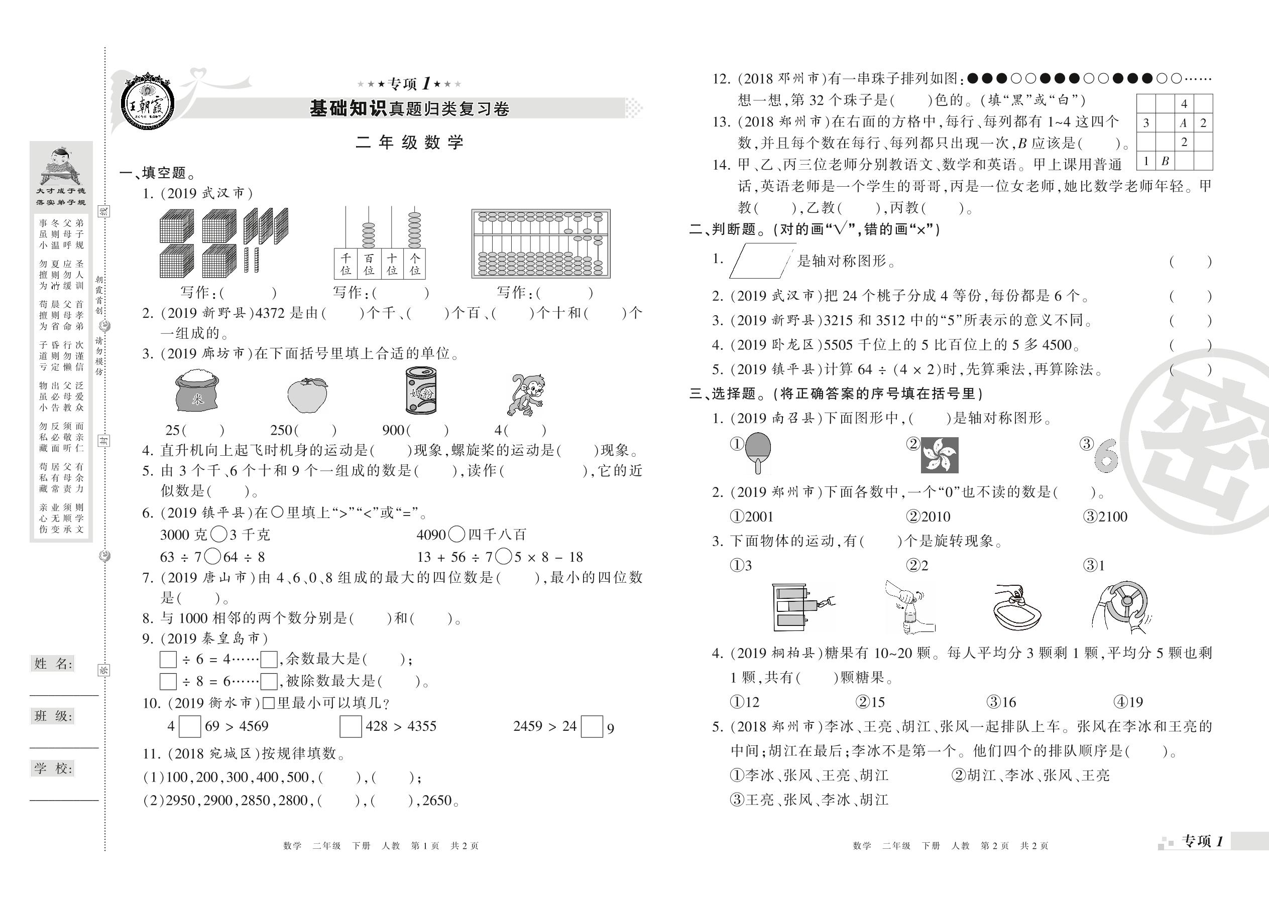 王朝霞期末专项卷——基础知识、计算真题归类复习卷二年级下册数学(人教版)_R21080391823【0】